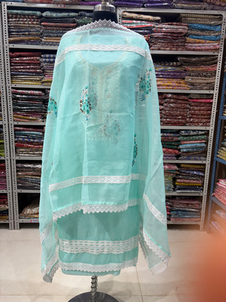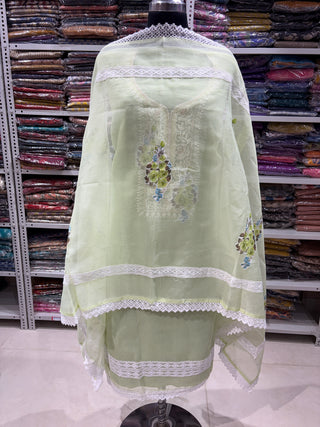 Light Green Kota Doria Embroidery Lace Work Floral Party Wear Suit (with extra lining included) Hand block kota doria suit set