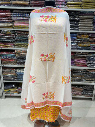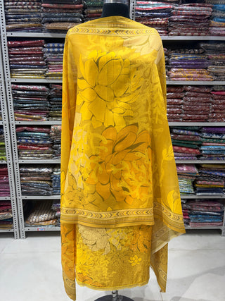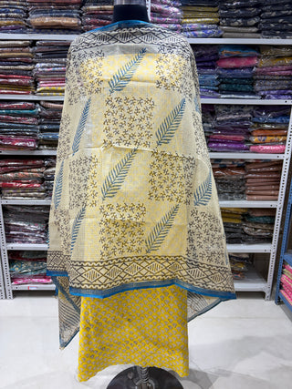 Yellow Cotton Handblock Office Wear Suit fabric with Kota Doria Dupatta