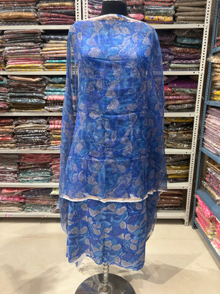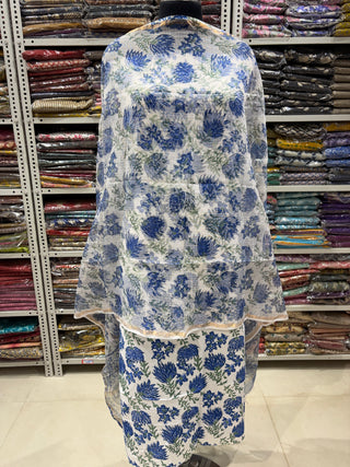 Blue Lotus Print Hand block kota doria suit set for office wear (with extra lining included)