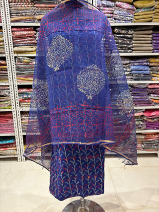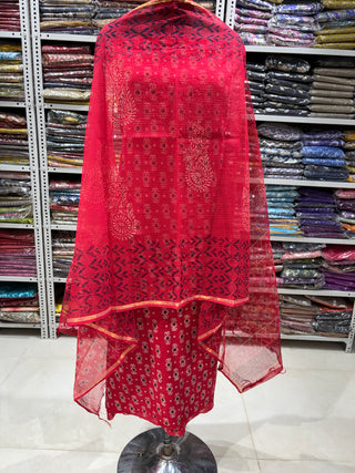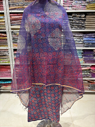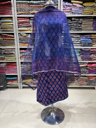 Ajrakh Cotton Handblock Office Wear Suit fabric with Kota Doria Dupatta