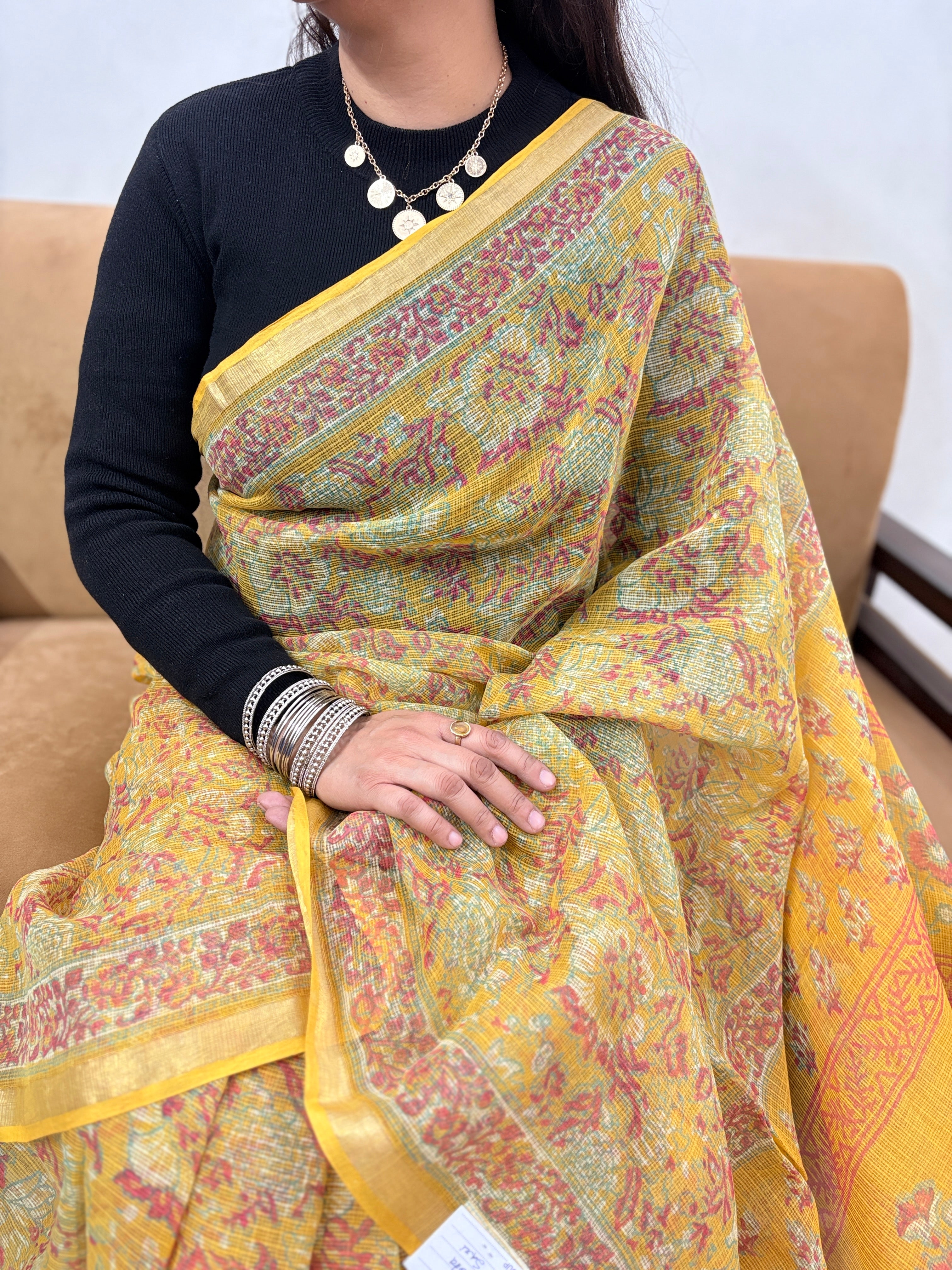 Handblock Print Kota Doria Saree with Zari border and Unstitched Blouse Piece(Lining Included)