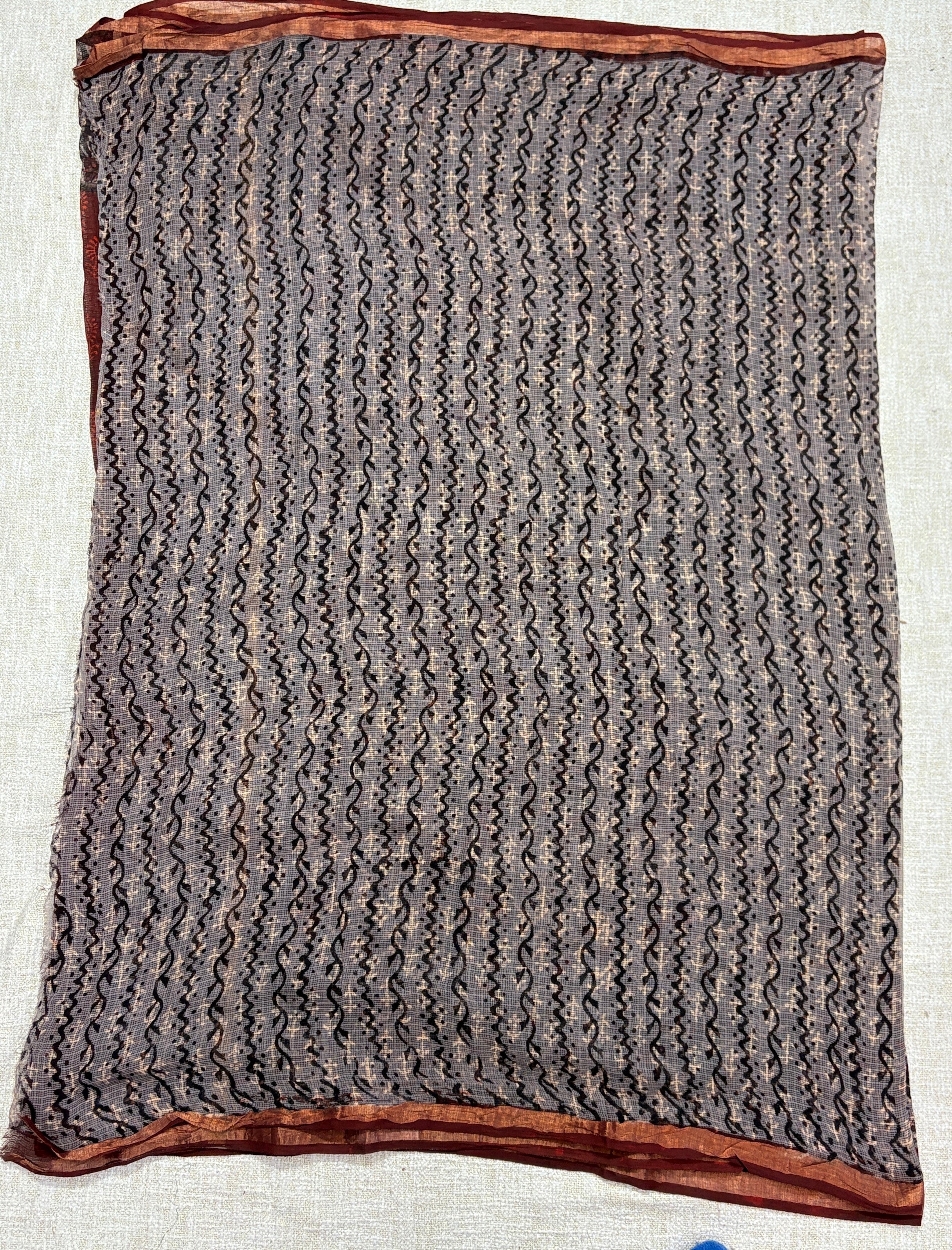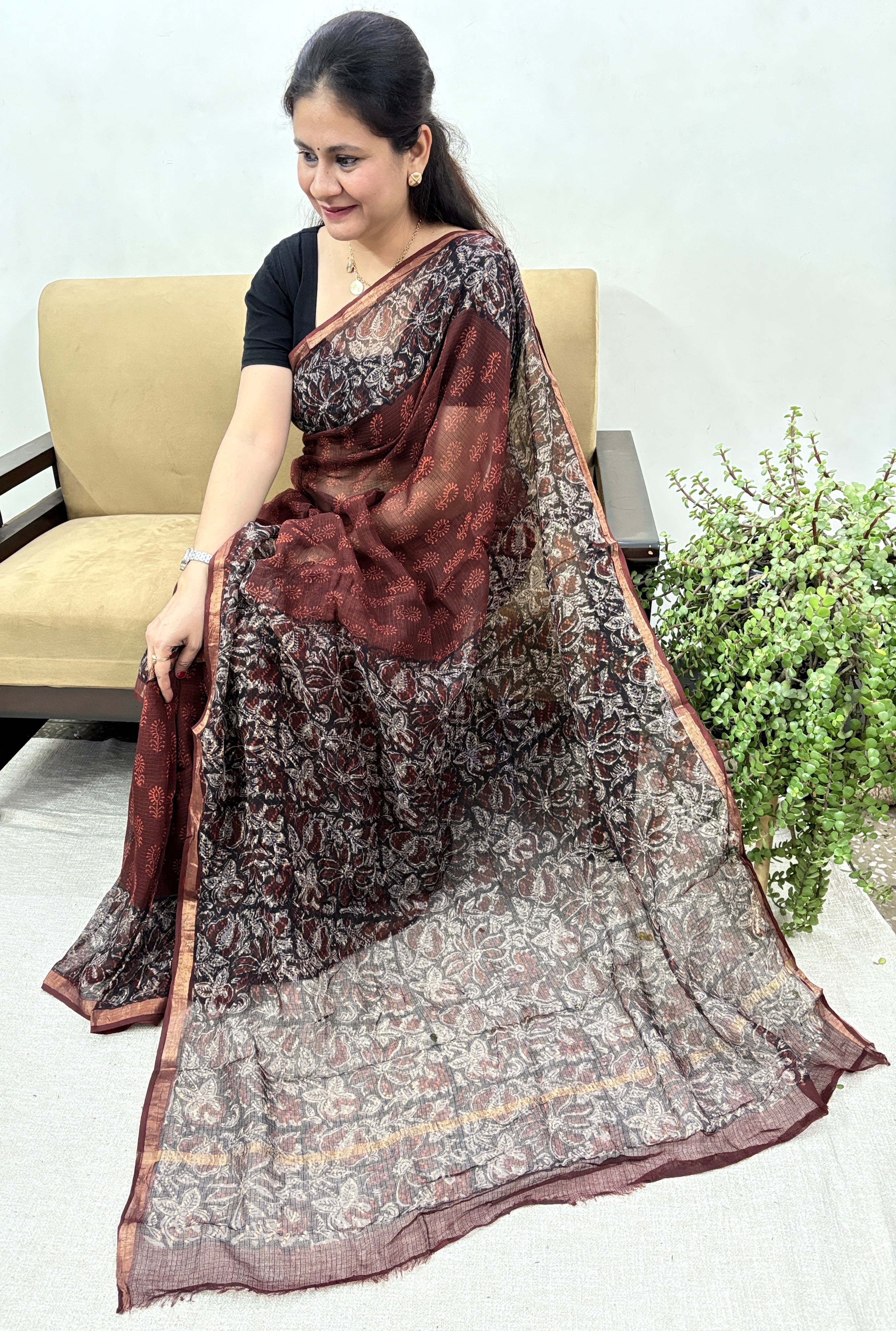 Burgundy Hand Block Printed Kota Doria Cotton Saree with Unstitched Blouse Piece(Lining Included)