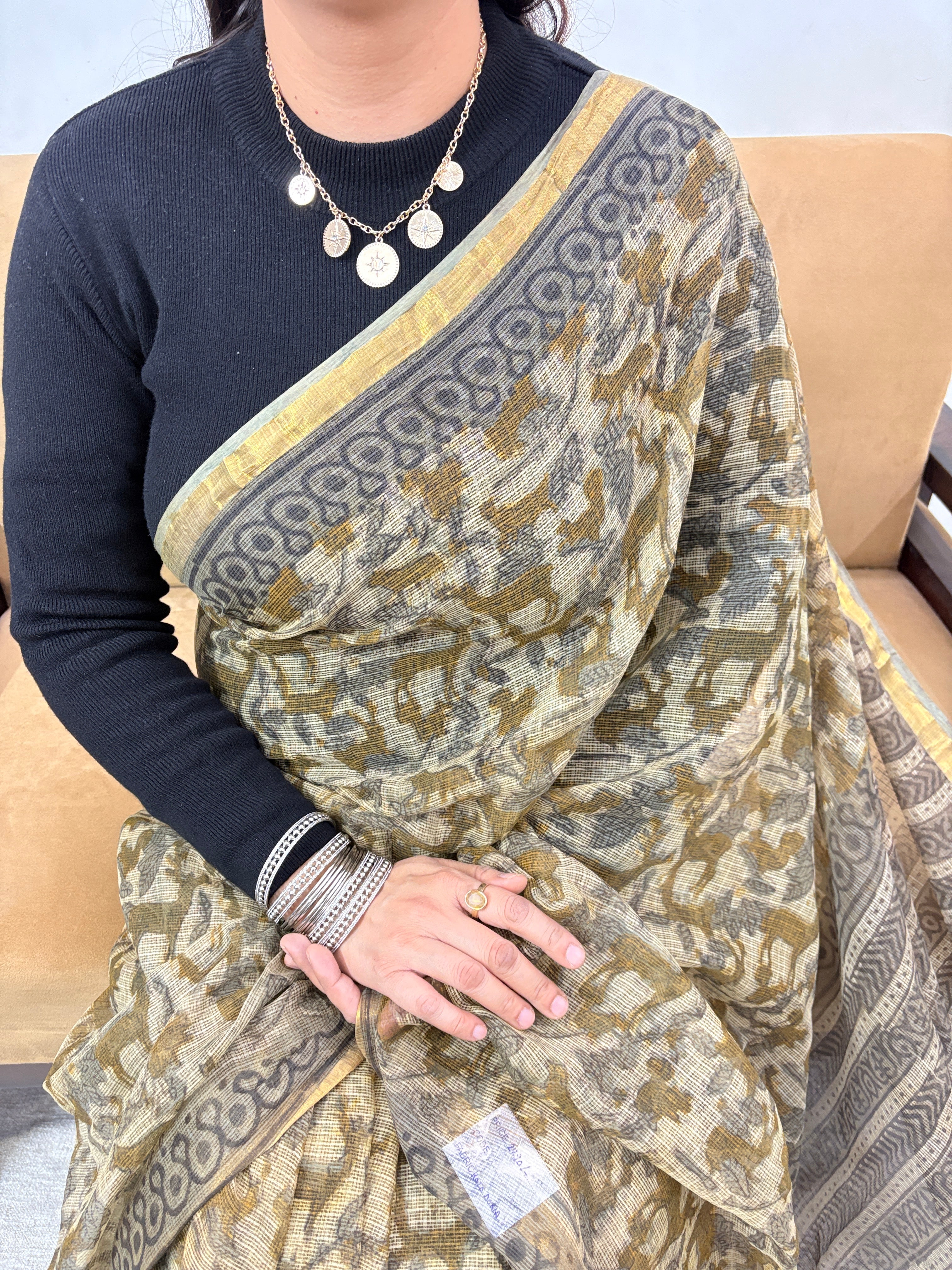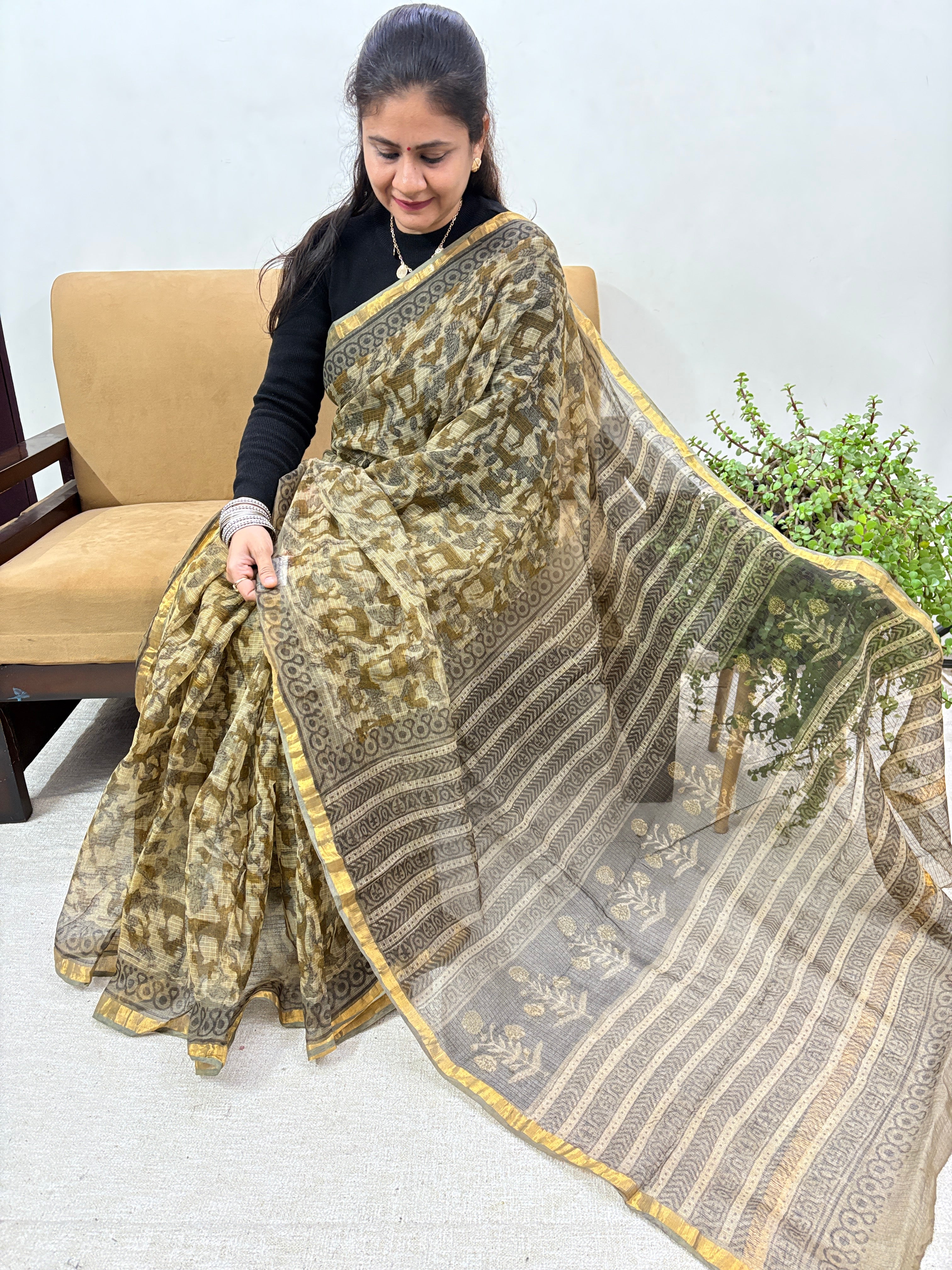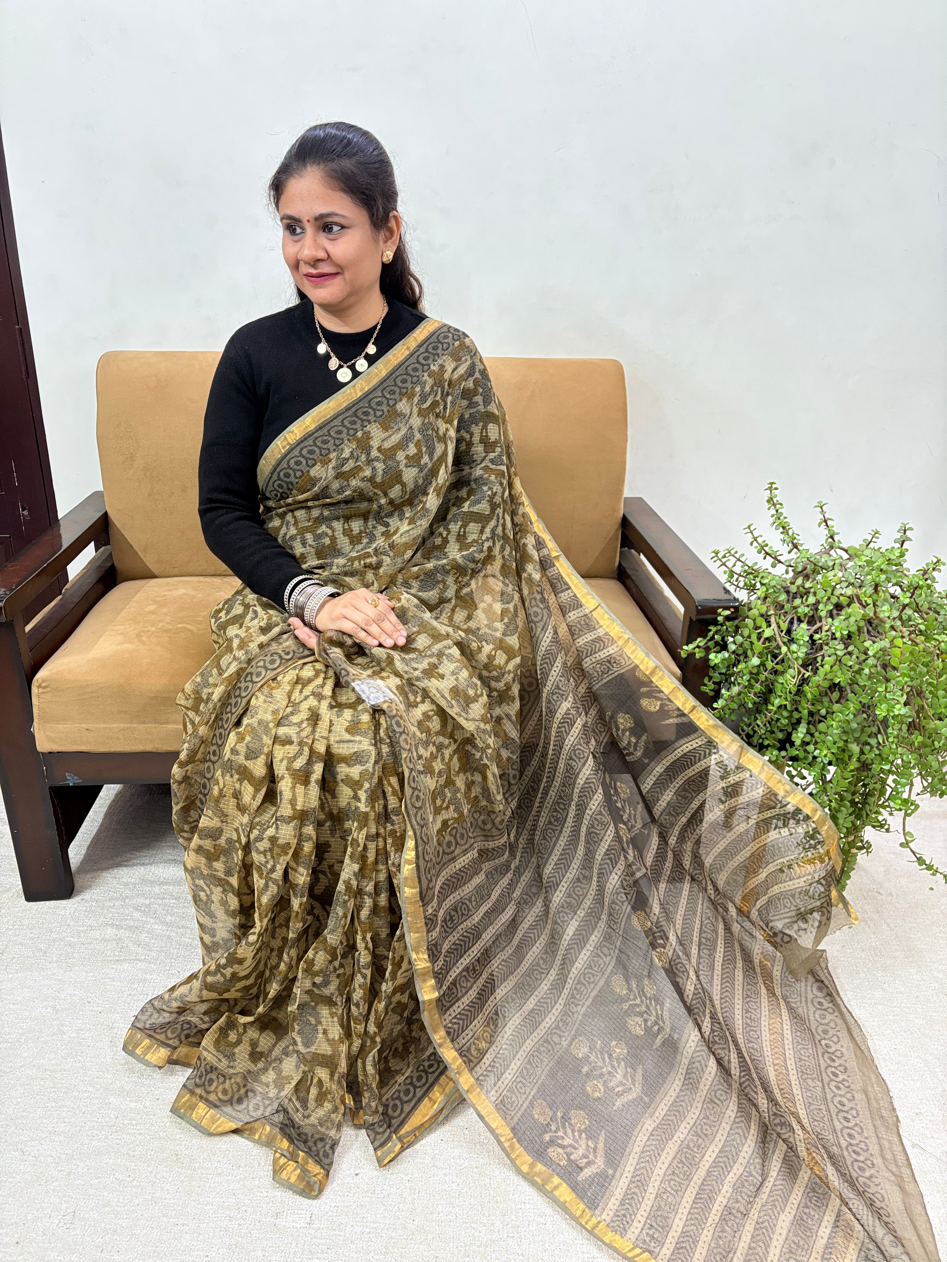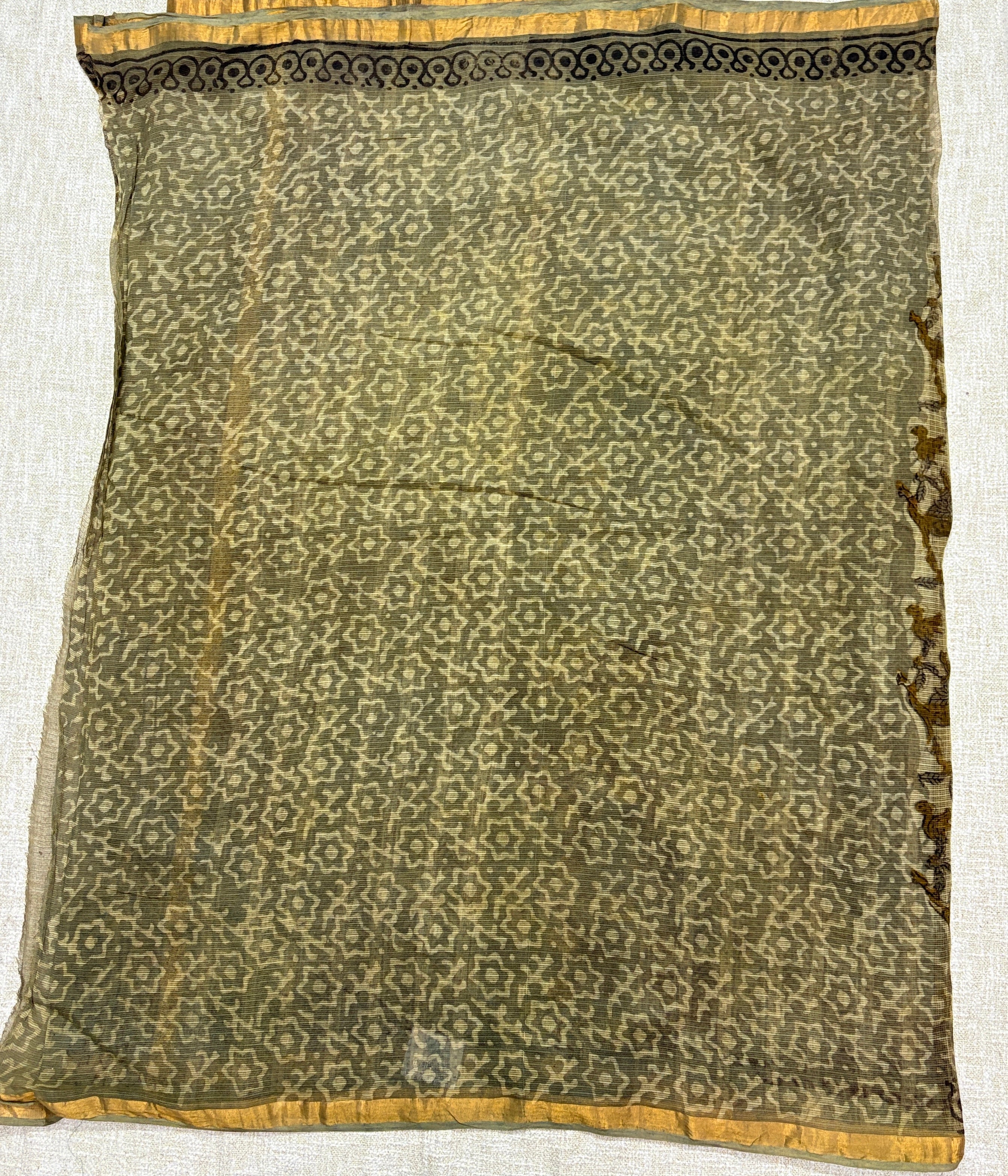 Vanaspati Ajrakh Hand Block Print Kota Doria Cotton Saree with zari border and unstitched Blouse Piece(Lining Included)