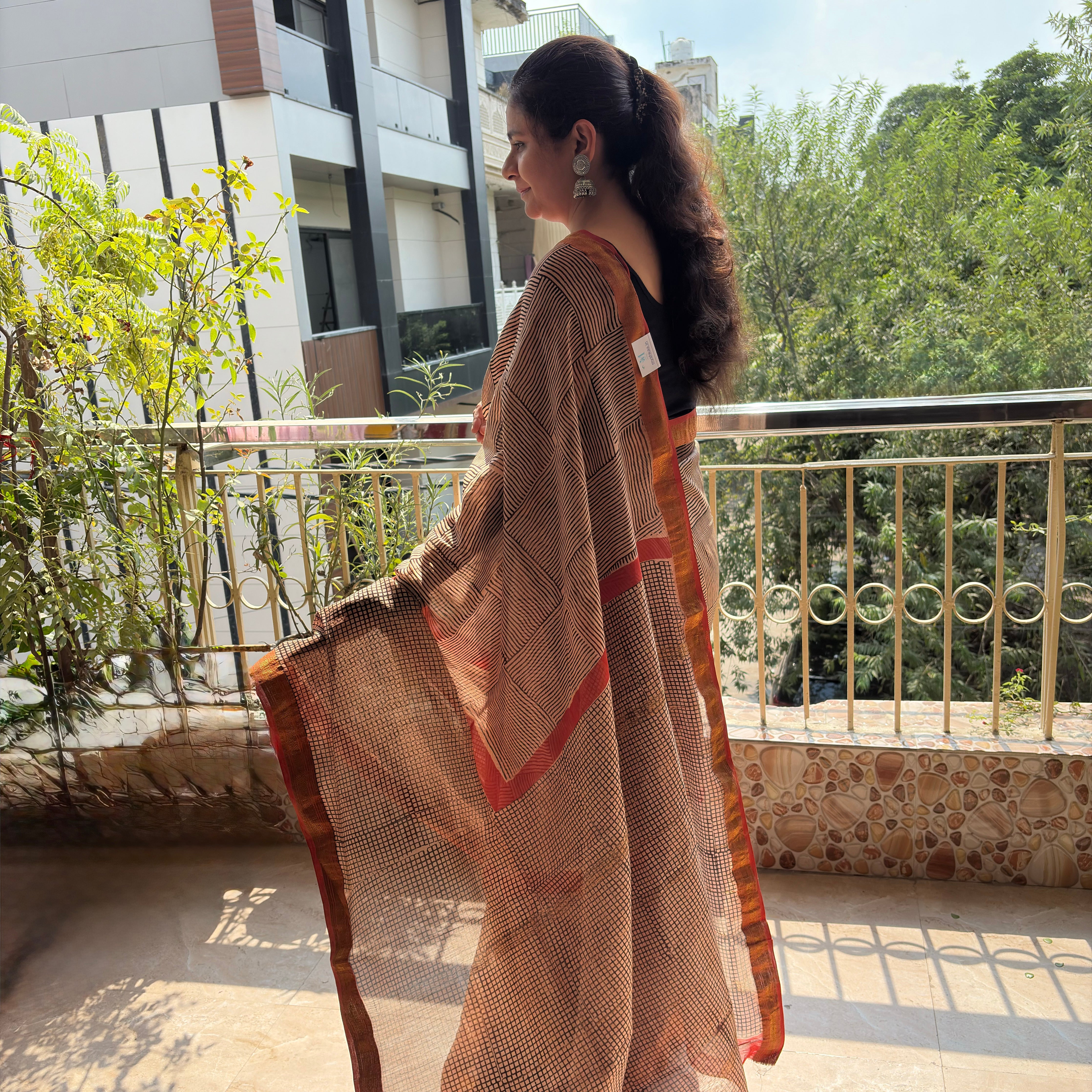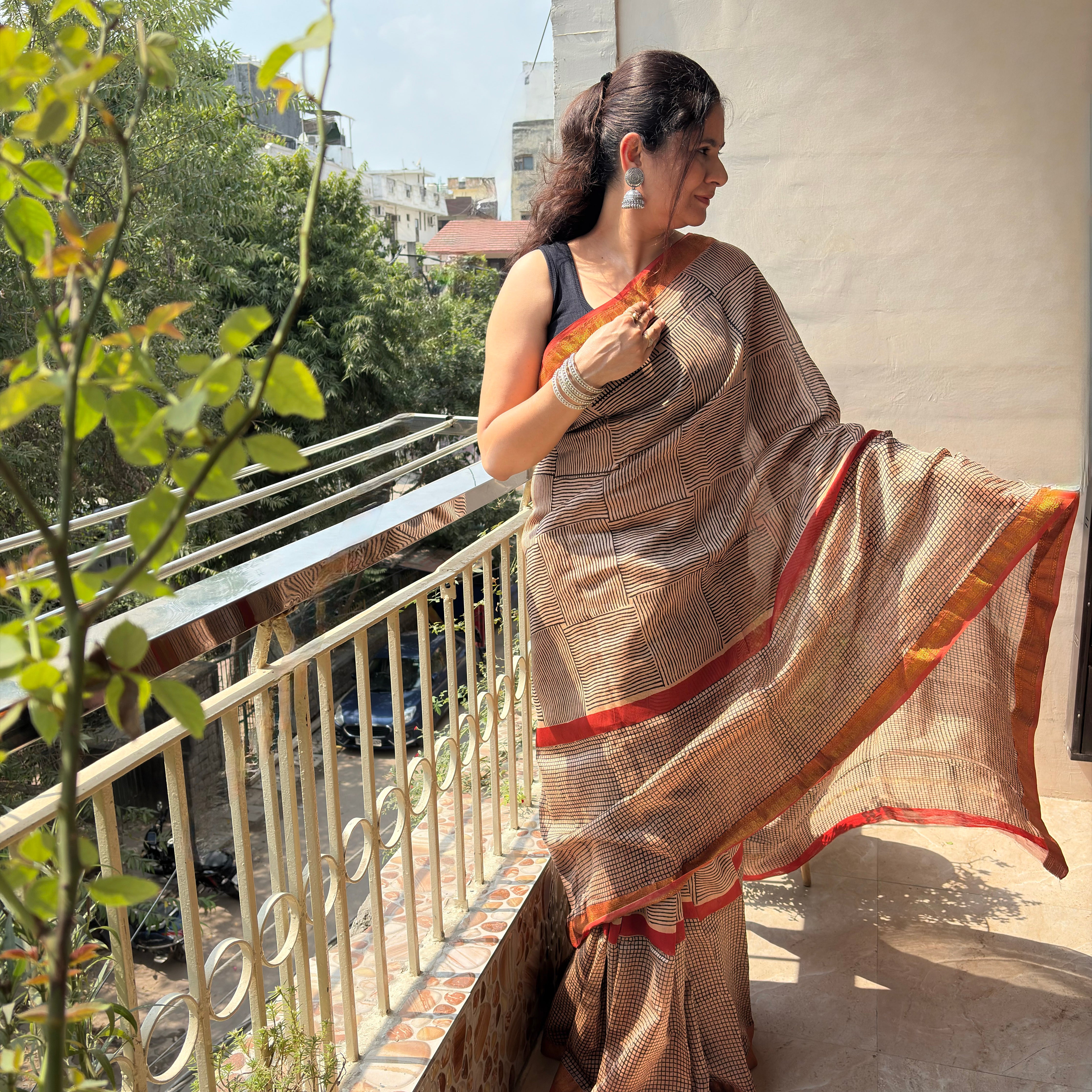 This Premium Brown Maheshwari Silk Saree with blouse piece is suitable for all occasions like functions, weddings, office or any formal events.