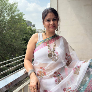 White Handblock printed Kota Doria Cotton Saree with Unstitched Blouse Piece