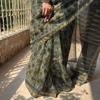 Hand Block Print Kota Doria Cotton Saree with zari border and unstitched Blouse Piece