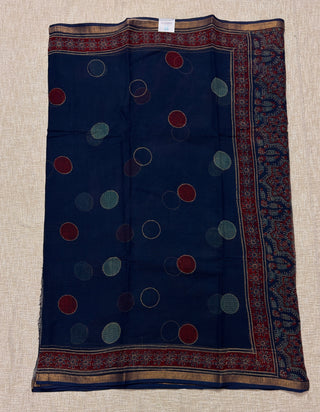 Ajrakh Handblock Print Kota Doria Cotton Saree with zari border and unstitched Blouse Piece
