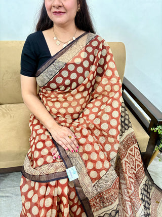 Ajrakh Handblock Print Kota Doria Cotton Saree with zari border and unstitched Blouse Piece(Lining Included)