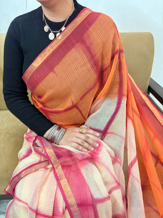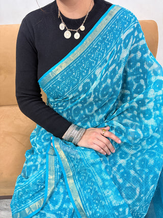 Shibori Handblock Print Kota Doria Cotton Saree with Zari border and Unstitched Blouse Piece(Lining Included)