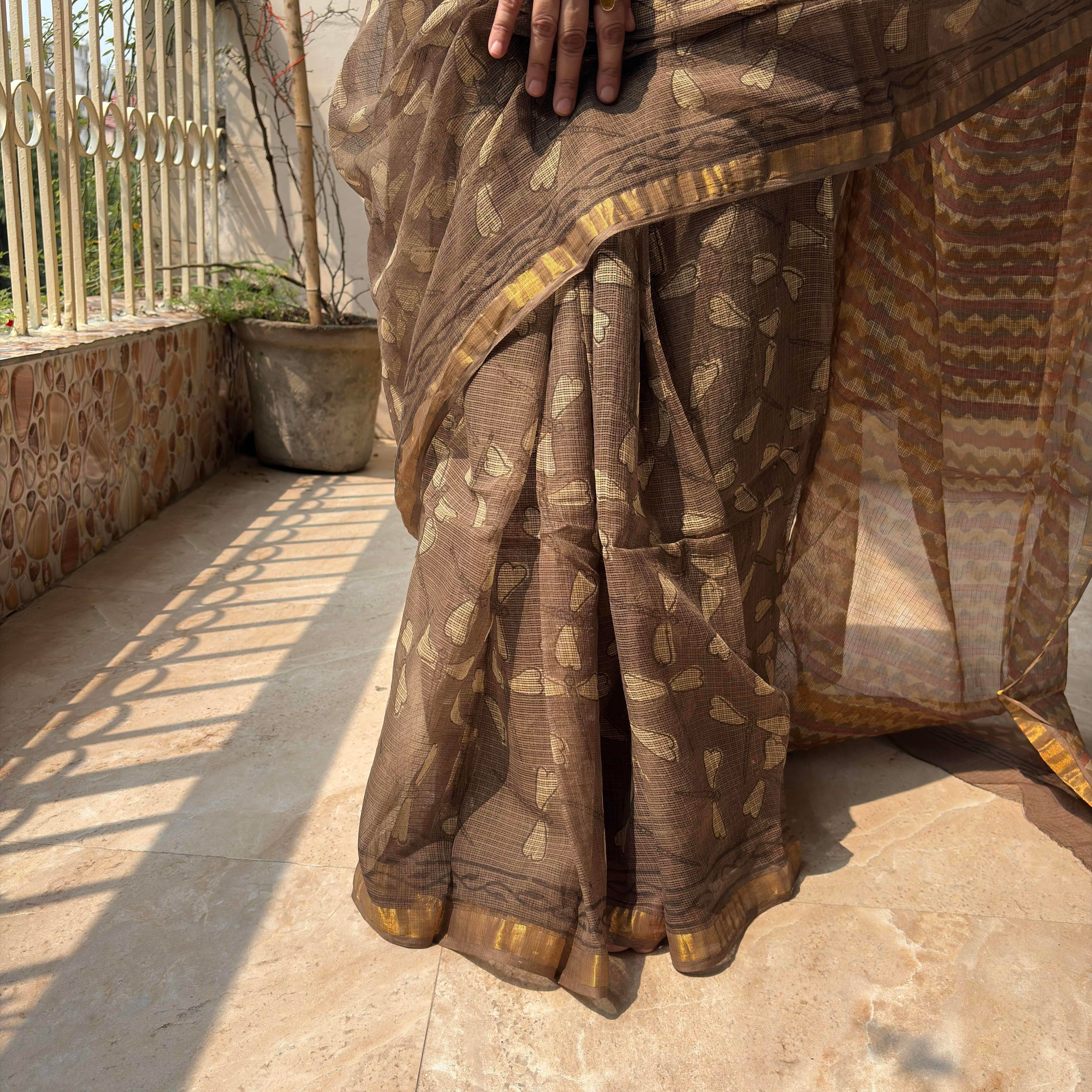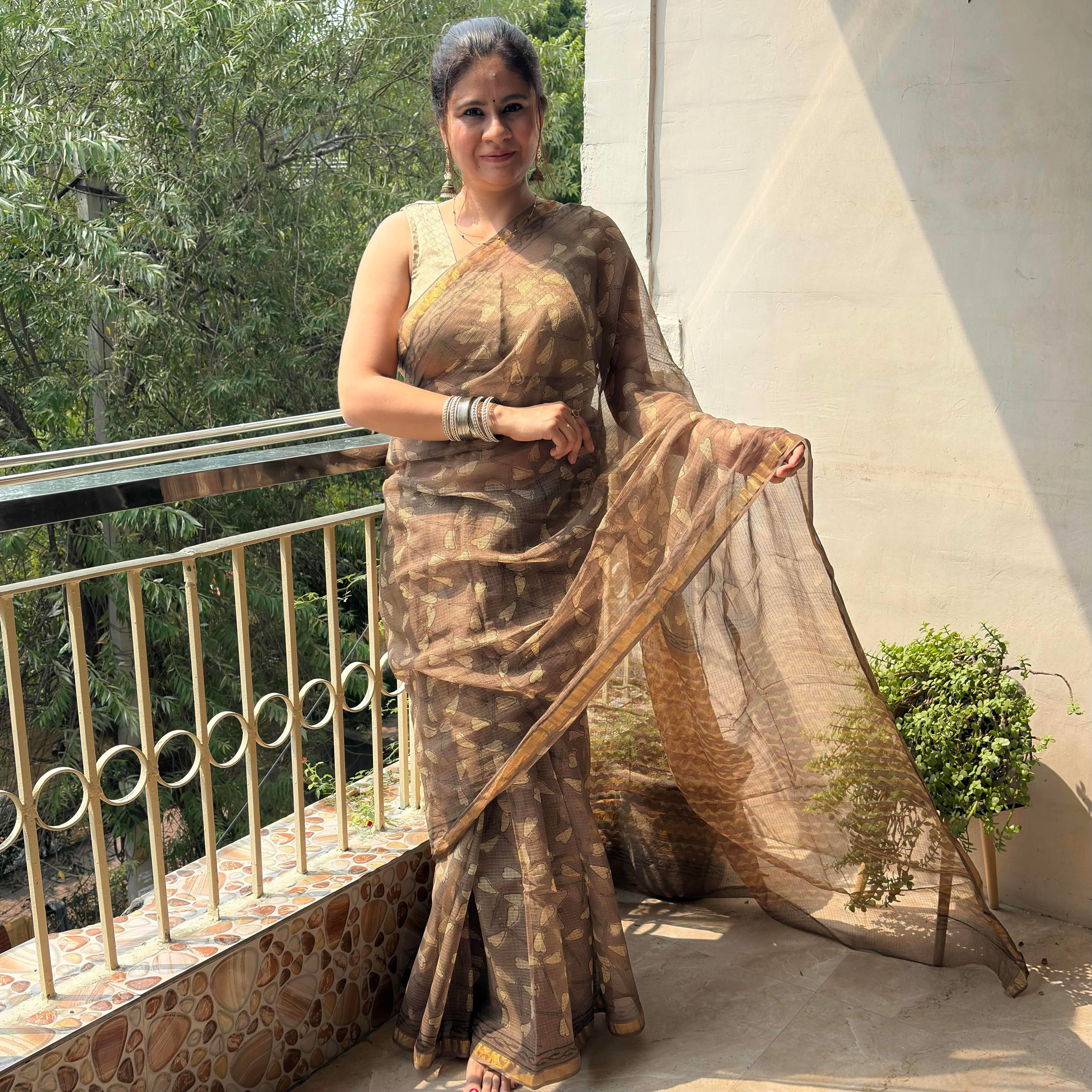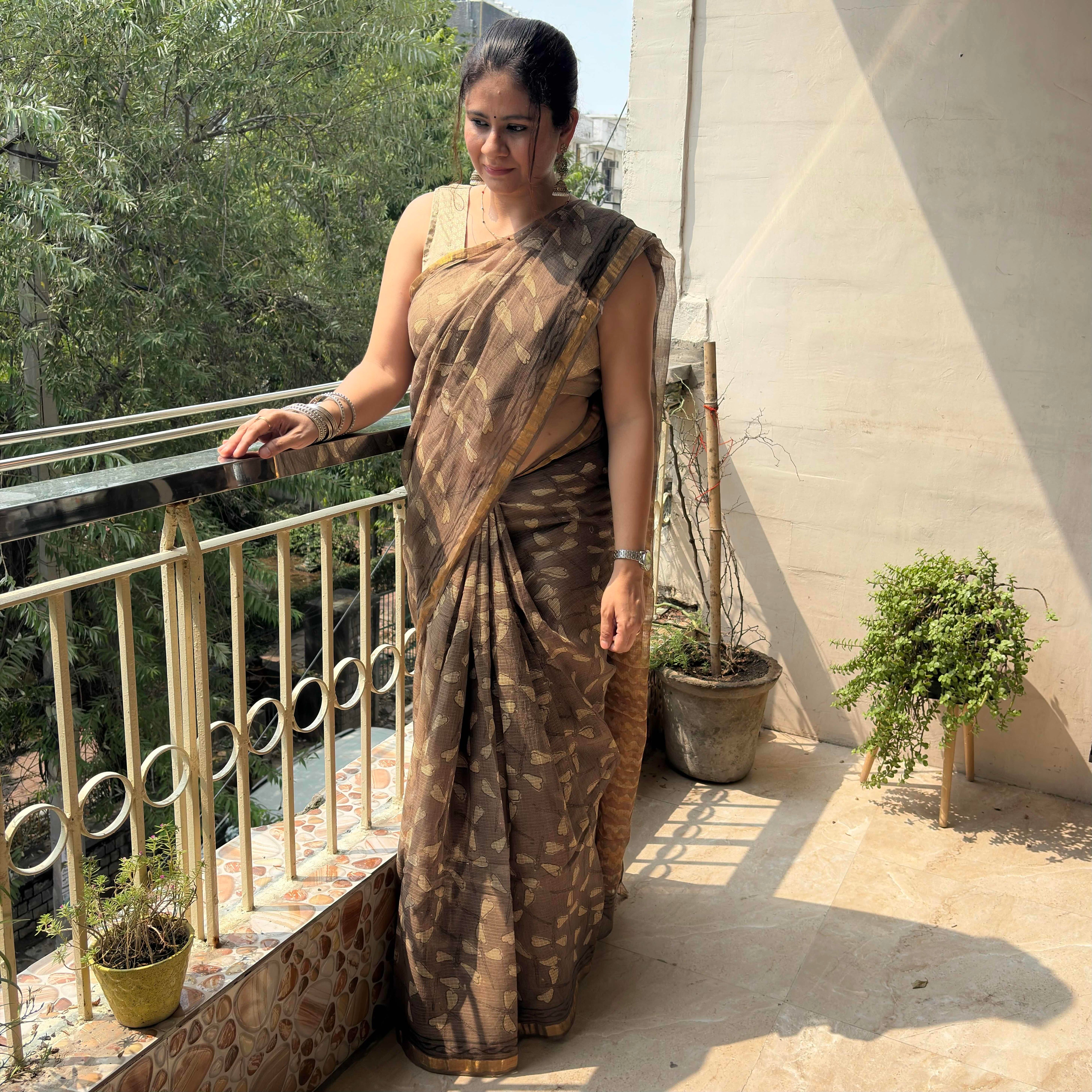 Vanaspati Ajrakh Hand Block Print Kota Doria Cotton Saree with zari border and unstitched Blouse Piece