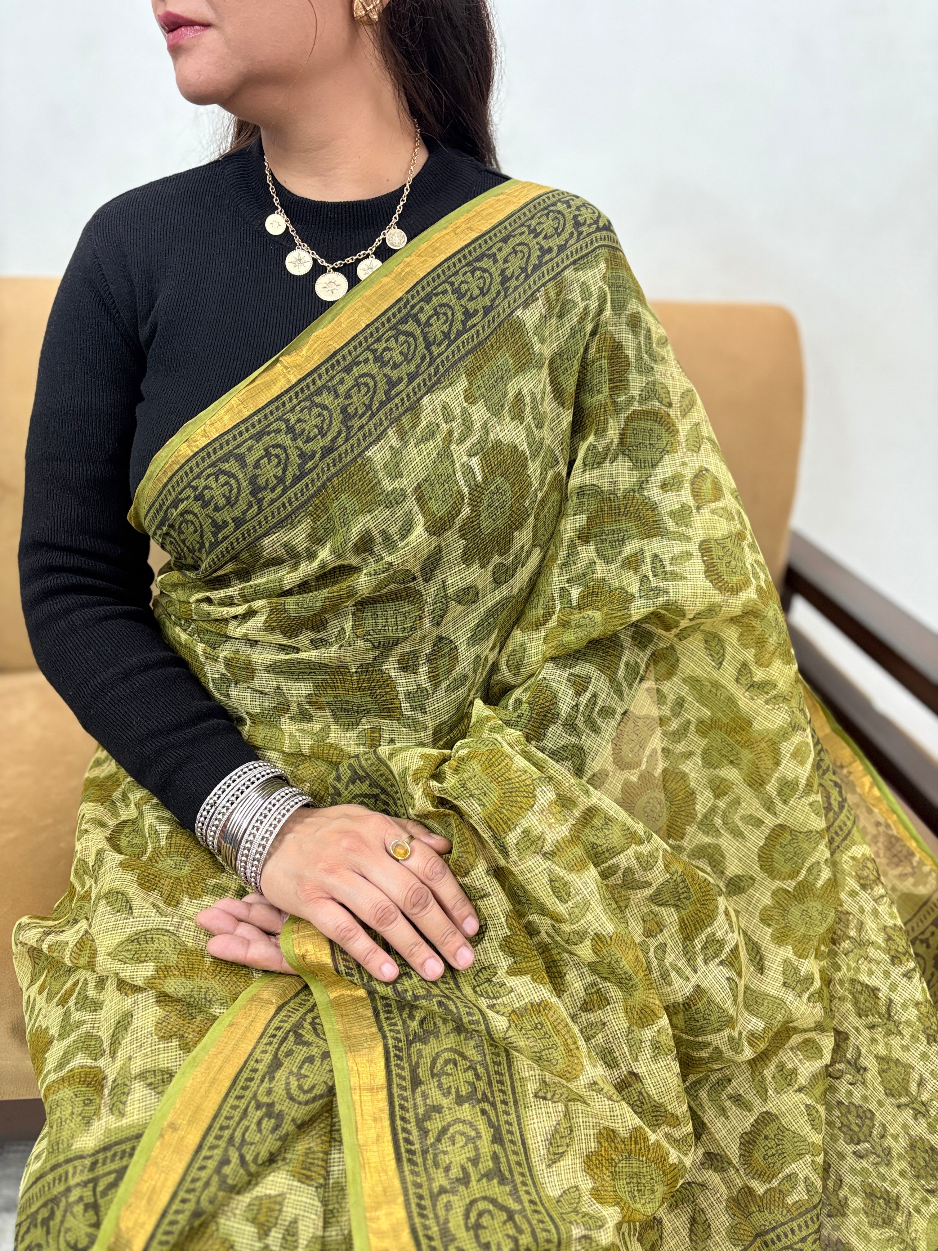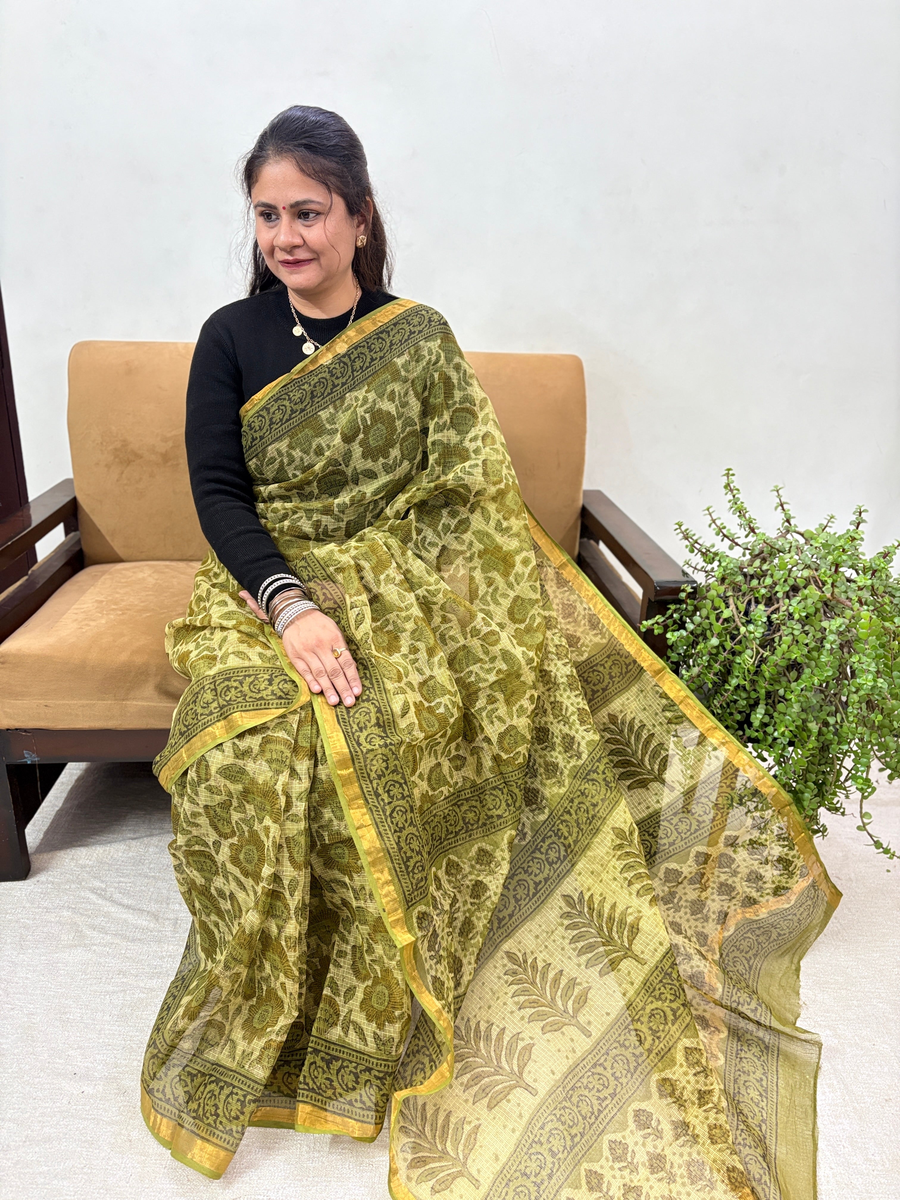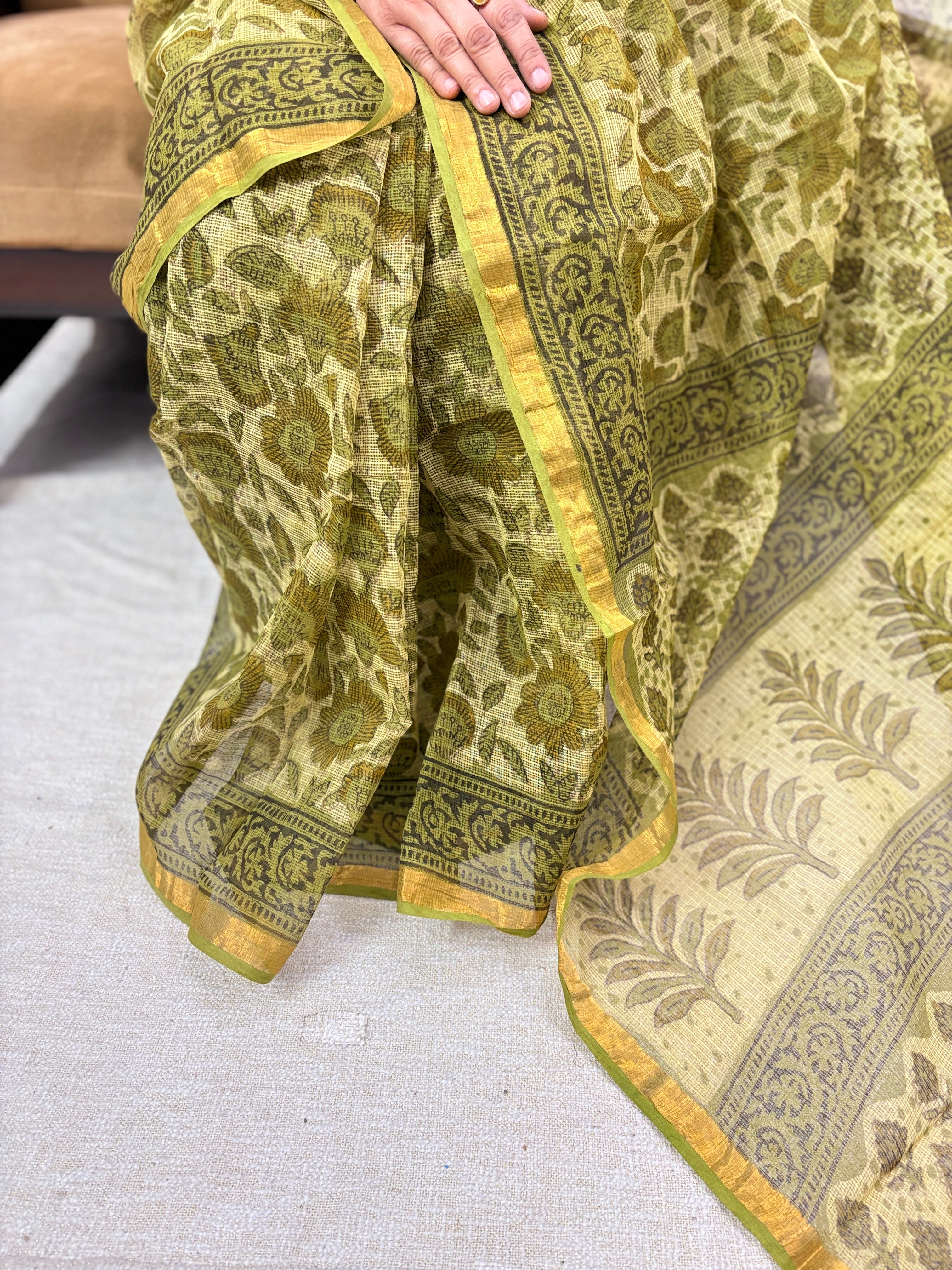 Vanaspati Ajrakh Hand Block Print Kota Doria Cotton Saree with zari border and unstitched Blouse Piece(Lining Included)