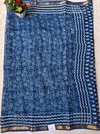 Handblock Print Kota Doria Saree with Zari Border and Unstitched Blouse Piece