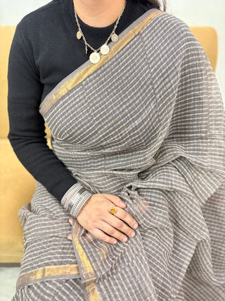Black Stripe Hand Block Print Kota Doria Cotton Saree with Zari border and Unstitched Blouse Piece(Lining Included)