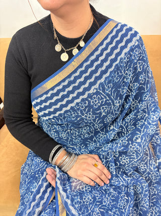 Handblock Print Kota Doria Saree with Zari border and Unstitched Blouse Piece(Lining Included)
