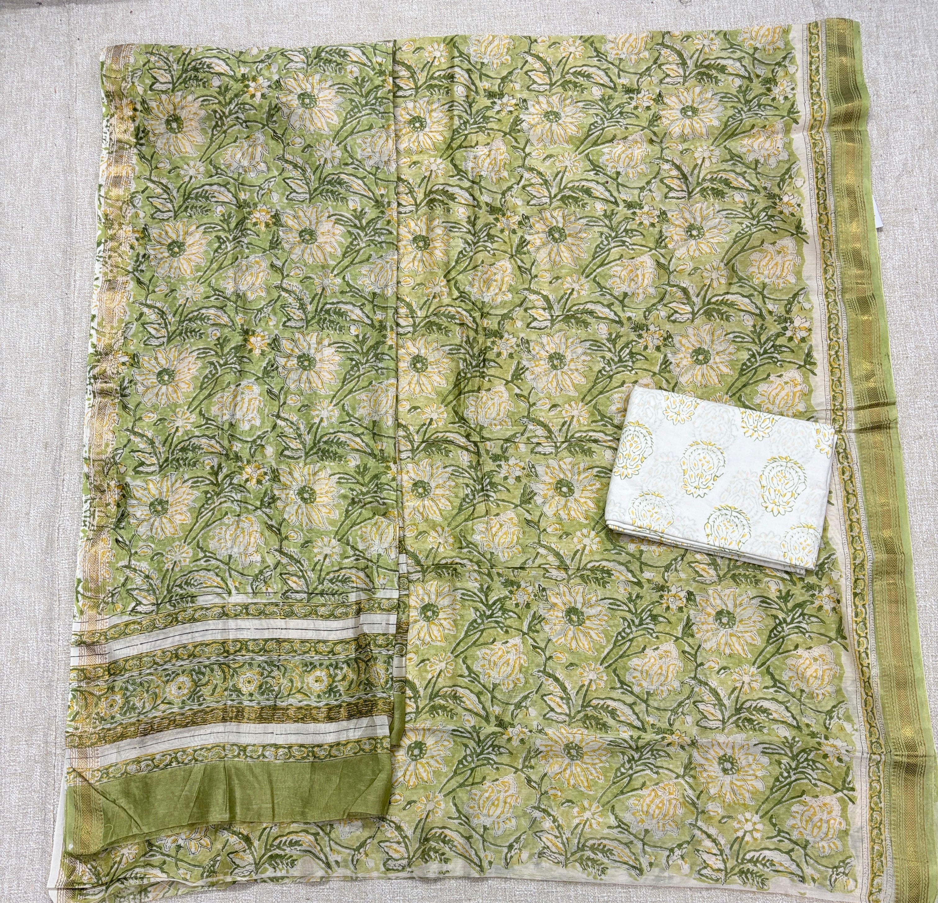Pista Green Handblock Maheshwari Suit Material with Maheshwari Dupatta(Lining Included)