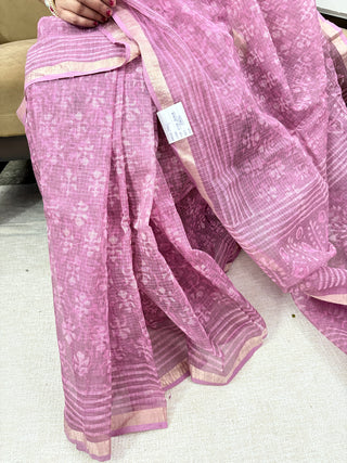 Pink Hand Block Print Kota Doria Cotton Saree with Unstitched Blouse Piece(Lining Included)