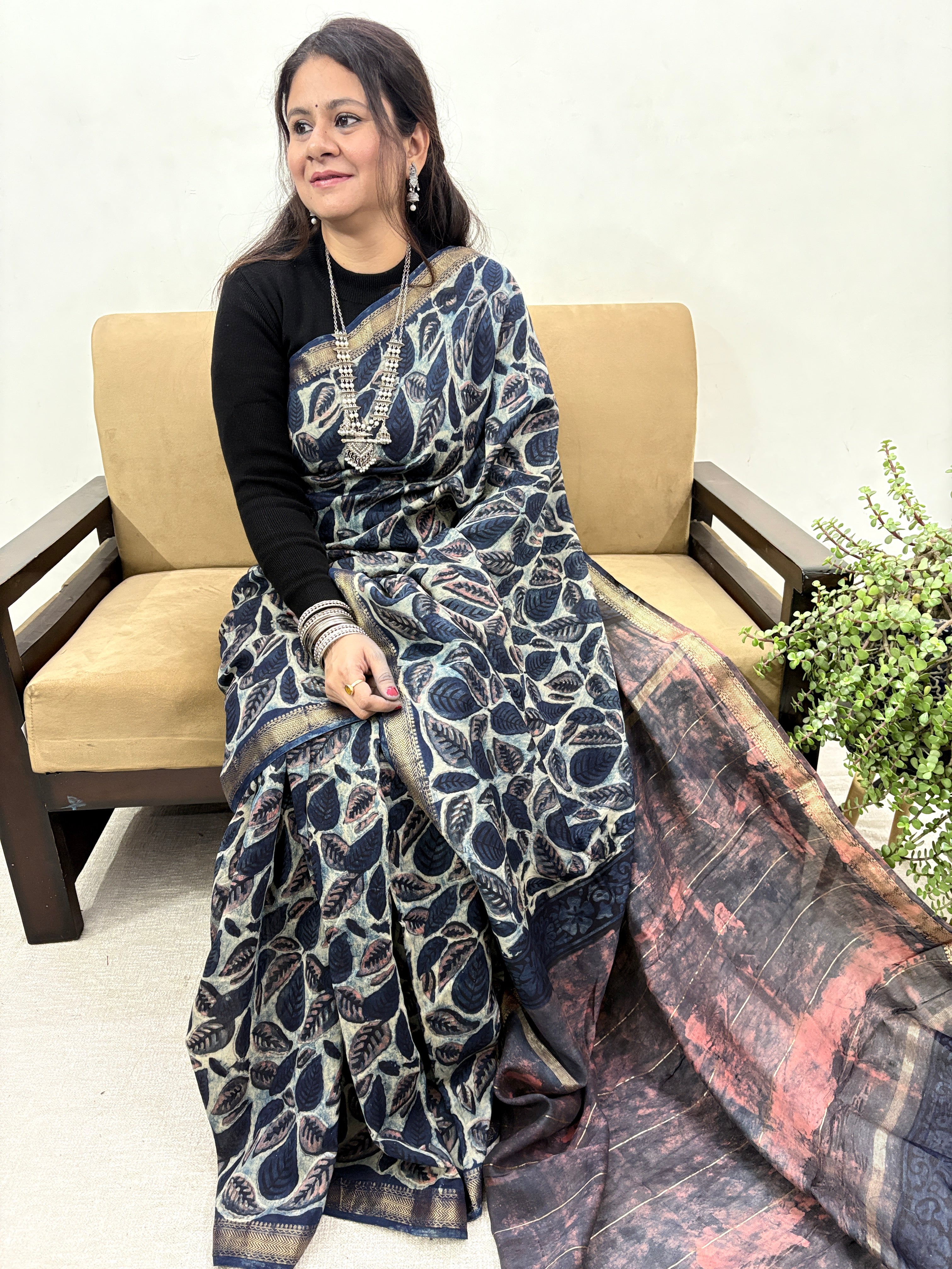 Vanaspati Ajrakh Maheshwari Silk Saree with Unstitched Blouse Piece (Lining Included)(No Chemical Dyes)