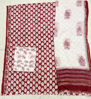 Red Cotton Handblock Office Wear Suit fabric with Kota Doria Dupatta