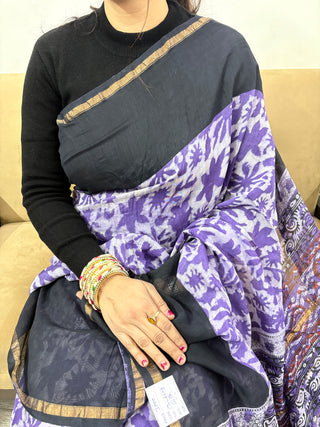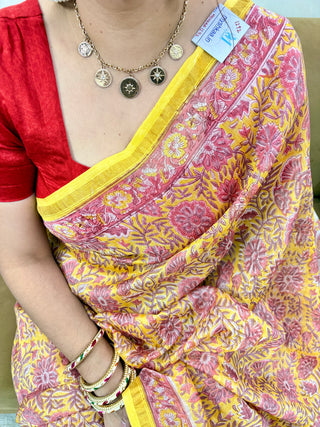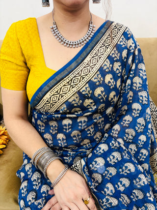 Handblock Chanderi Silk Saree with Zari Border and Unstitched Blouse Piece (Lining Included)