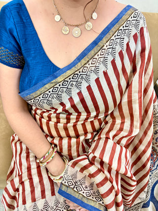 Ajrakh Print Chanderi Silk Saree with Zari Border and Unstitched Blouse Piece (Lining Included)