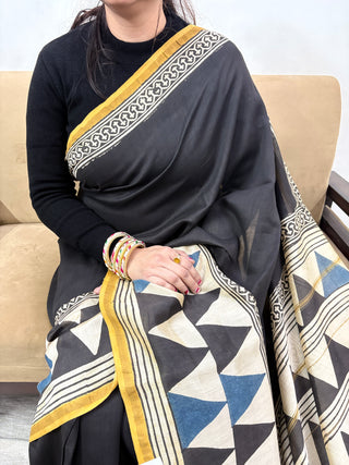 Geometric Print Black Chanderi Silk Saree with Unstitched Blouse Piece (Lining Included)