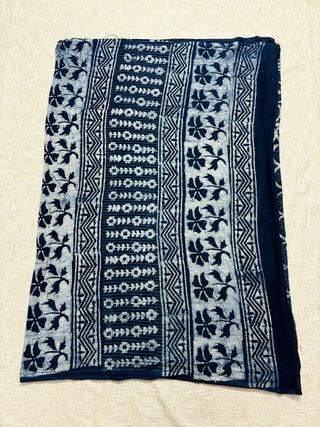 Indigo Hand Block Print Cotton Saree with Unstitched Blouse Piece