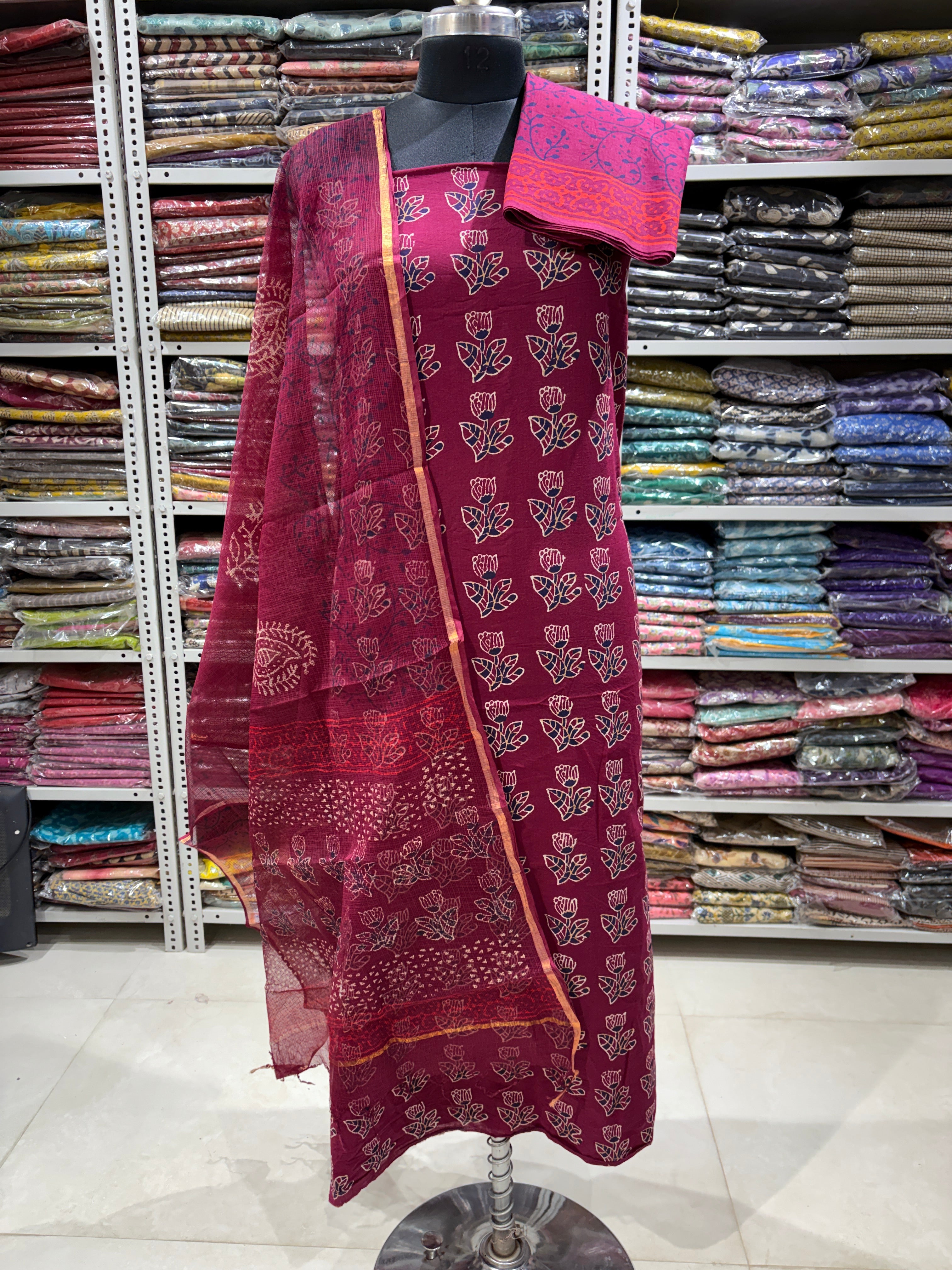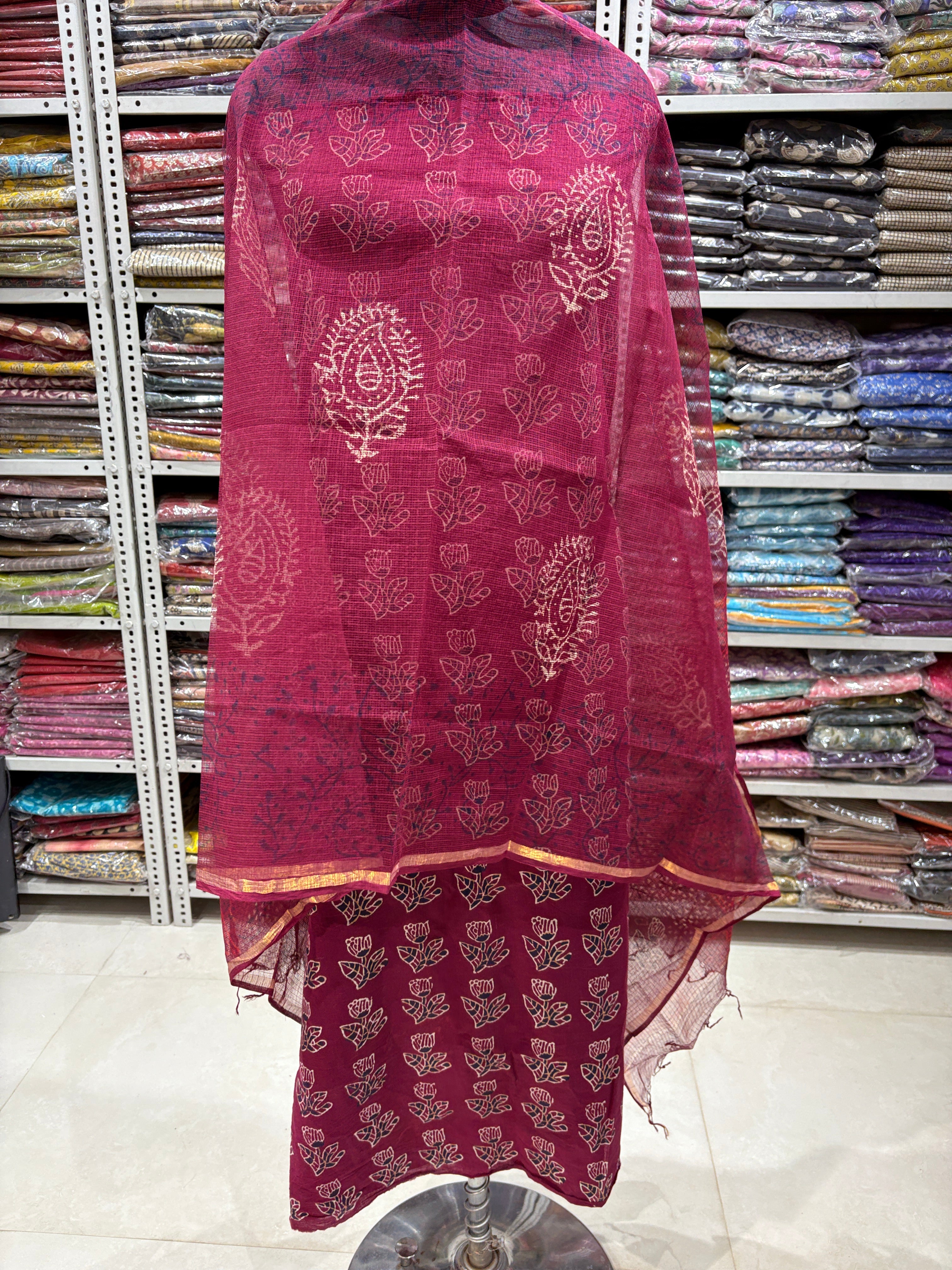 Ajrakh Cotton Handblock Office Wear Suit fabric with Kota Doria Dupatta