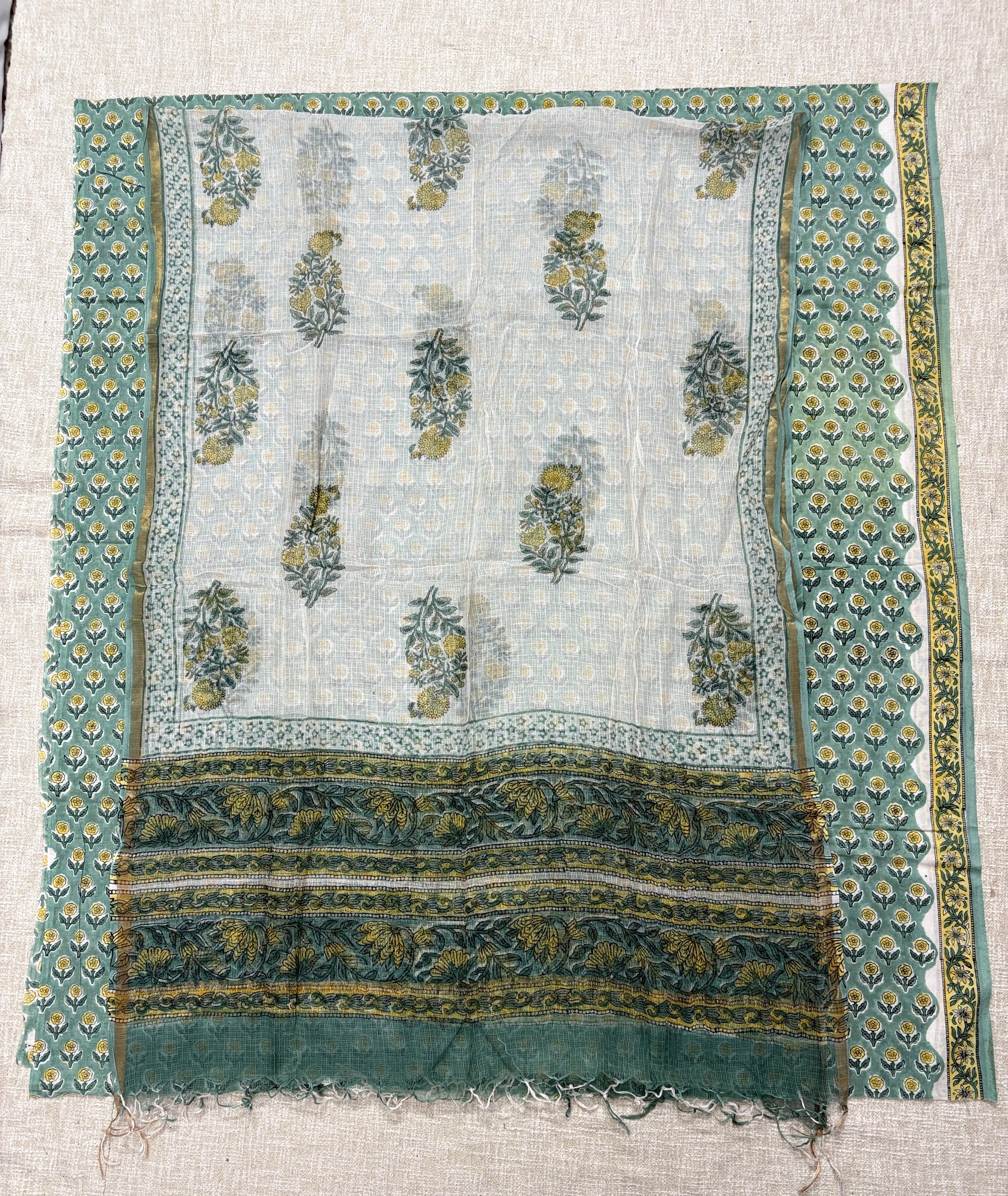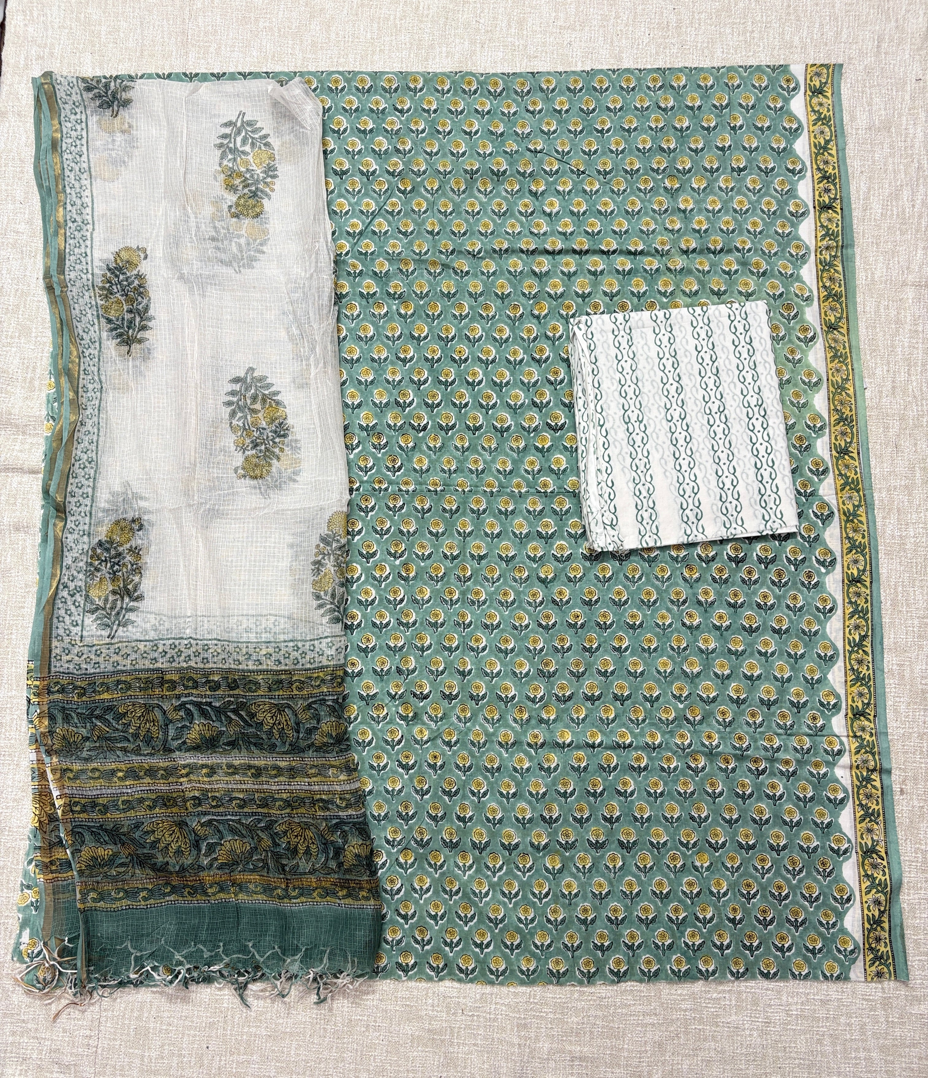 Green Cotton Handblock Office Wear Suit fabric with Kota Doria Dupatta