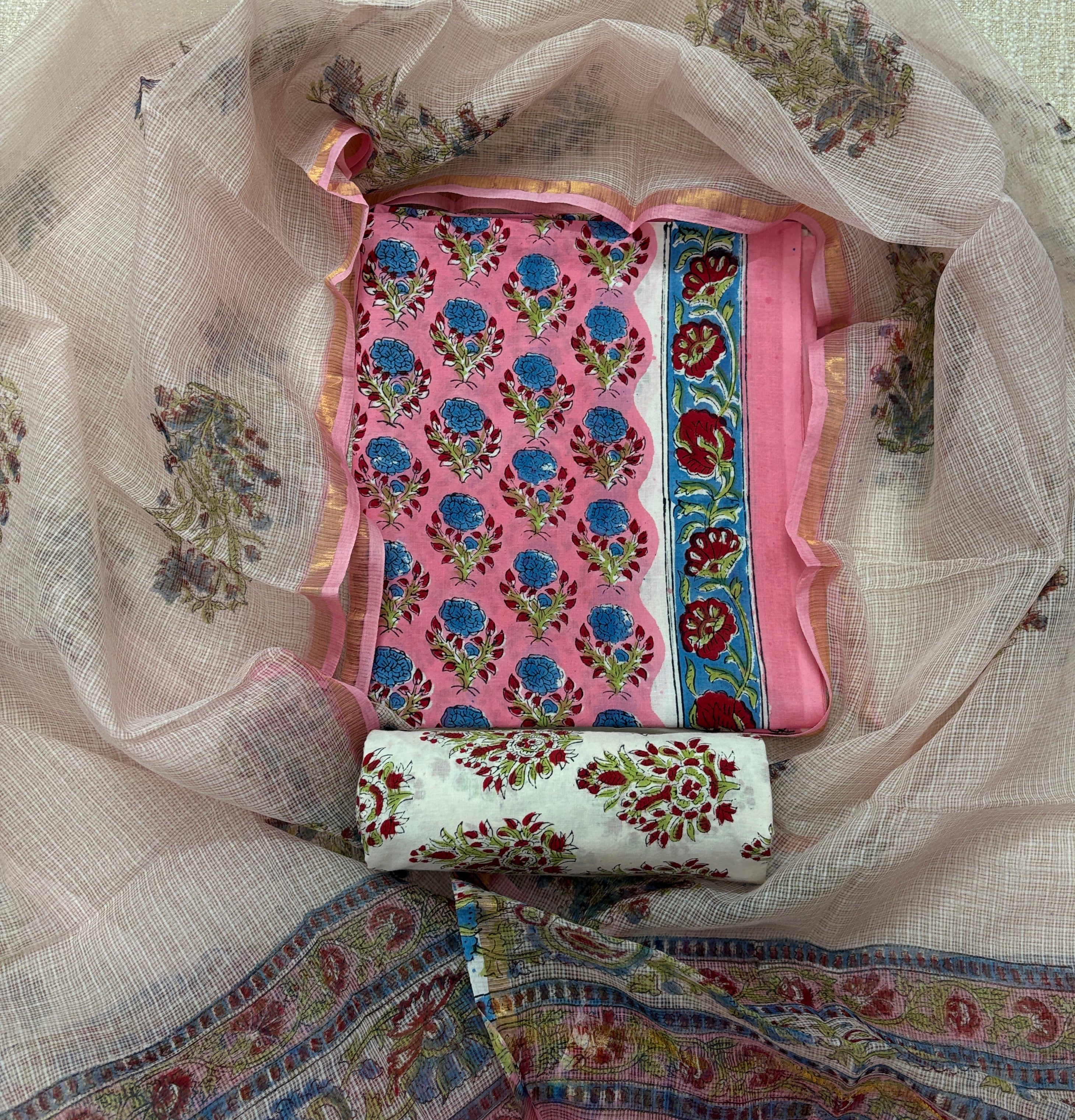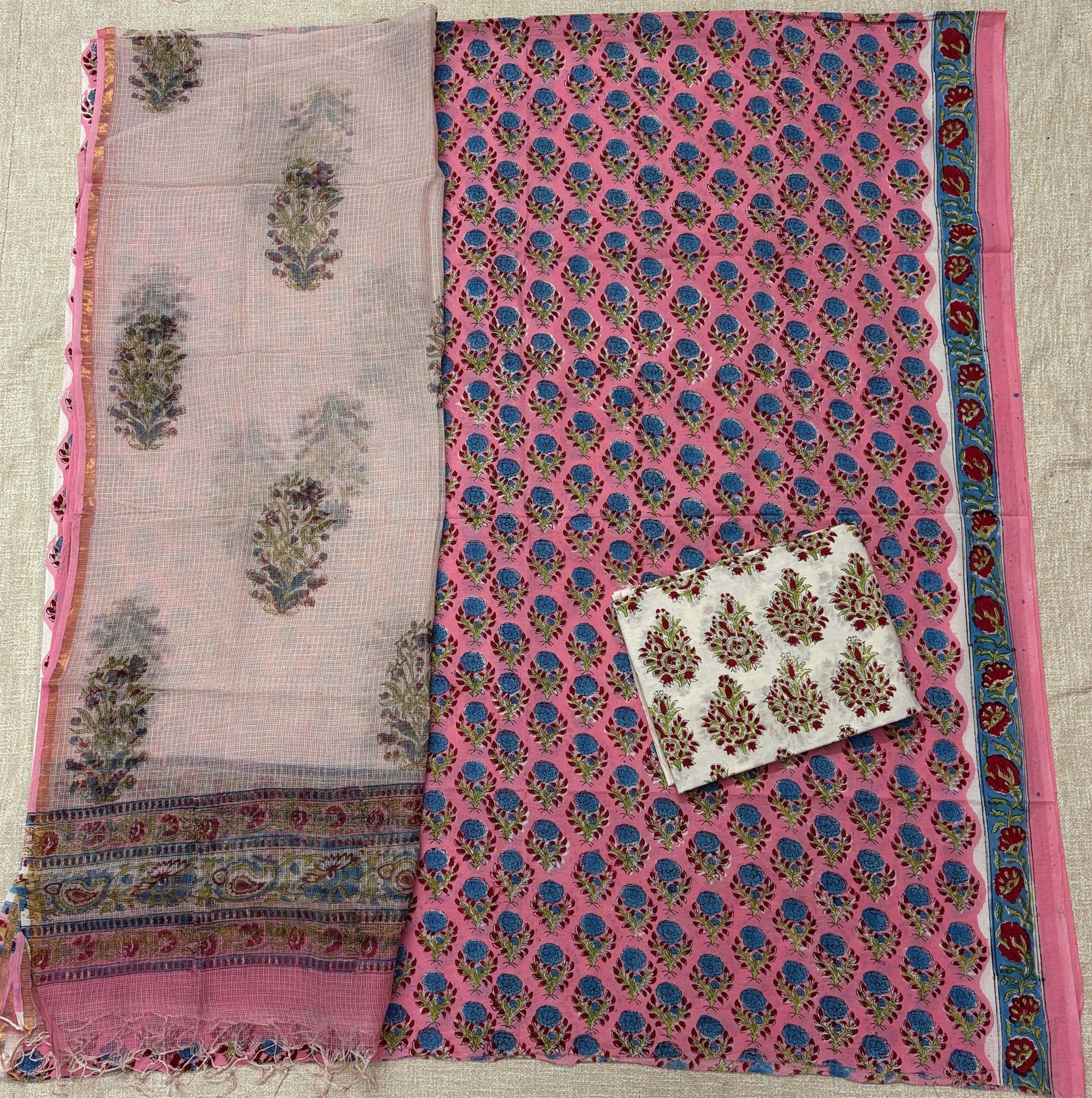 Cotton Handblock Office Wear Suit fabric with Kota Doria Dupatta (Code : 979)