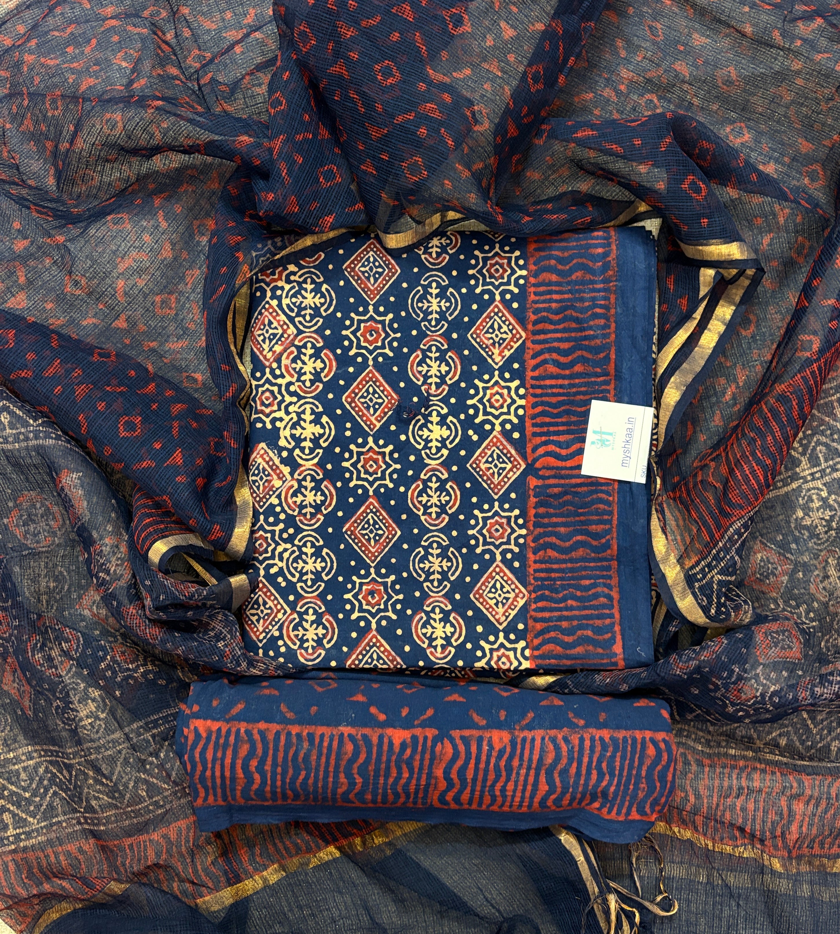 Ajrakh Print Cotton Handblock Office Wear Suit fabric with Kota Doria Dupatta (Code : 986)