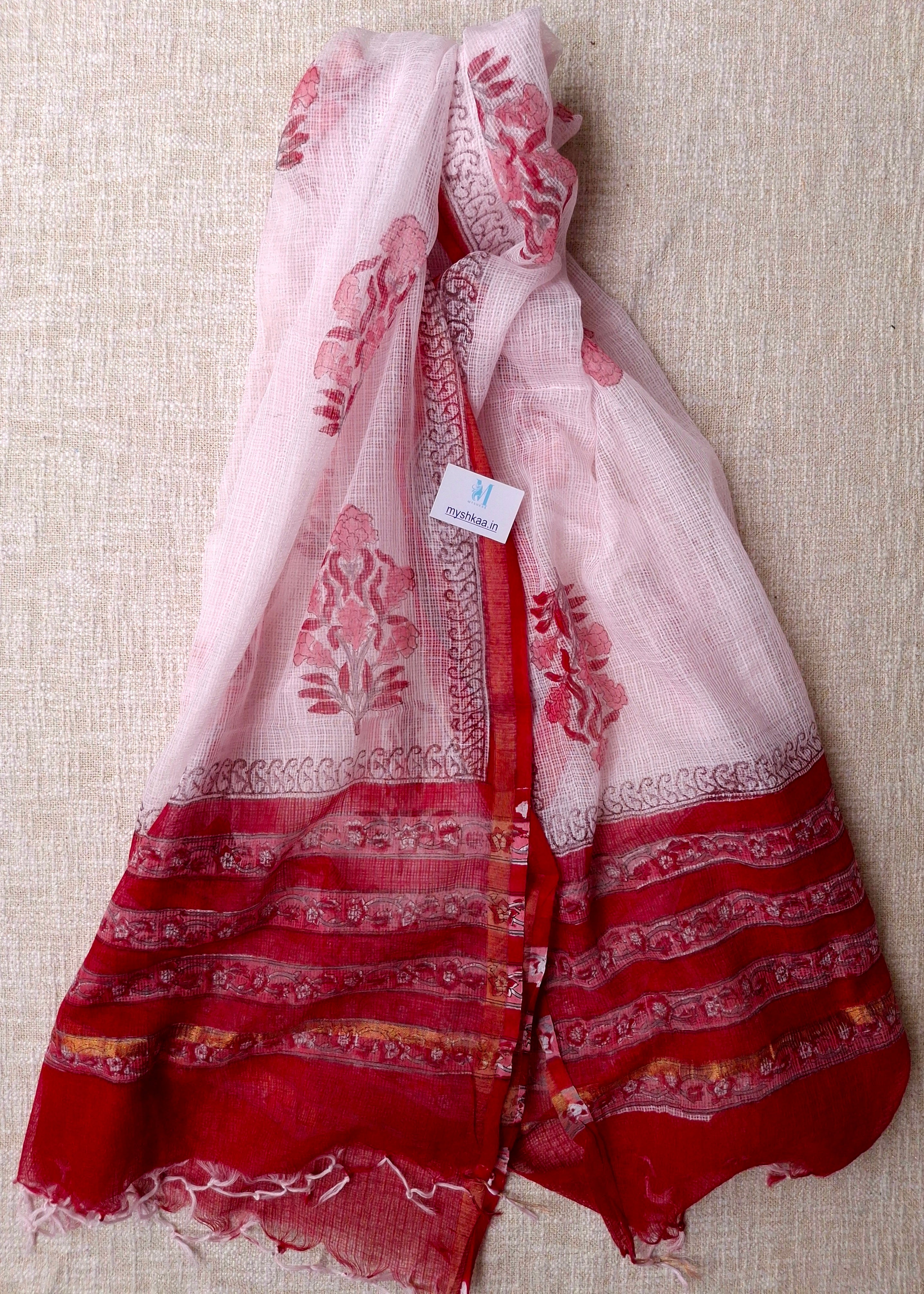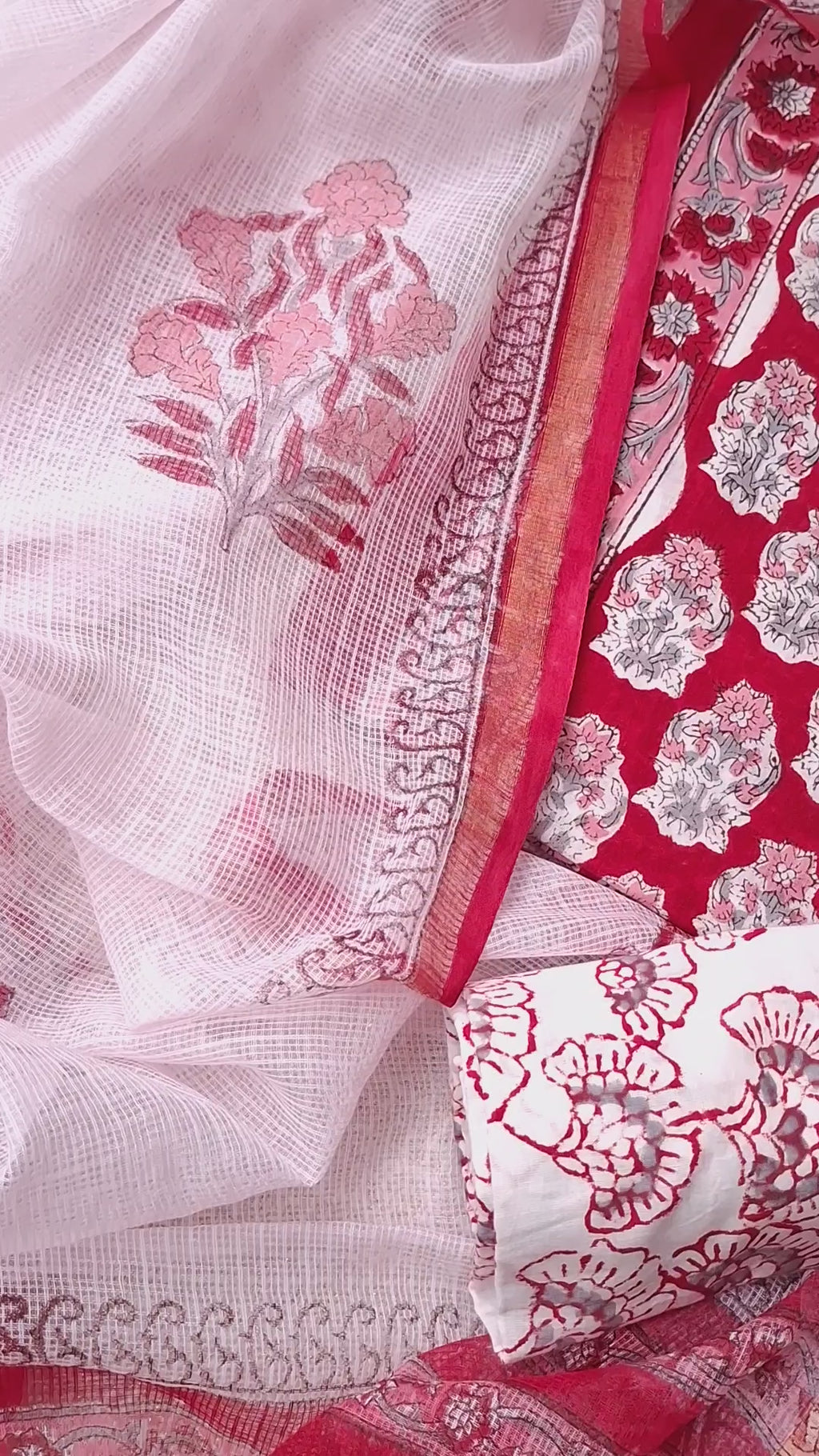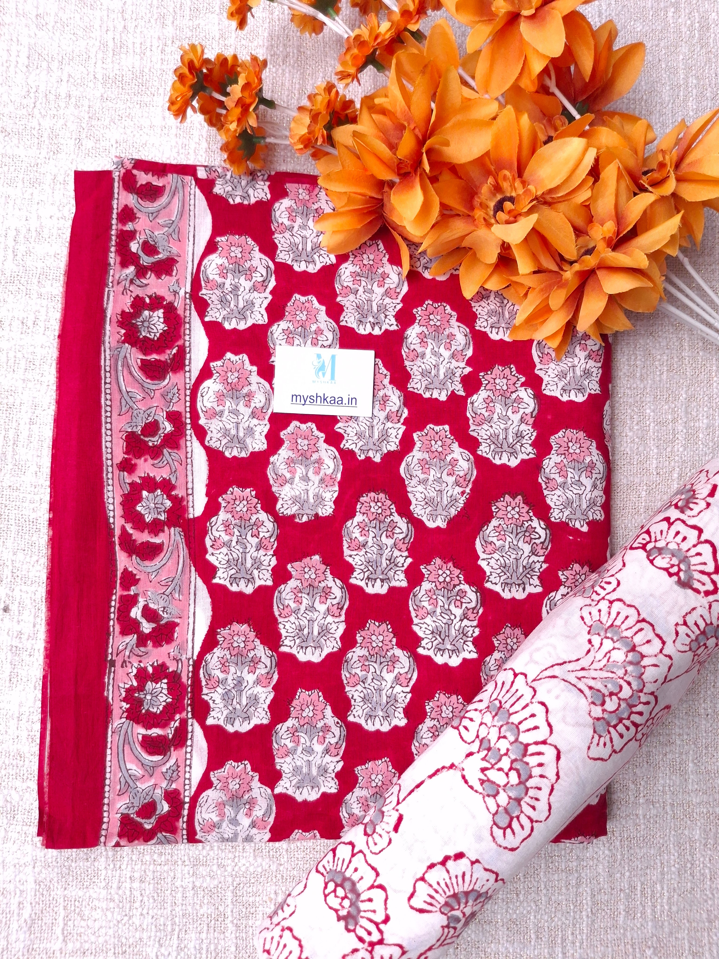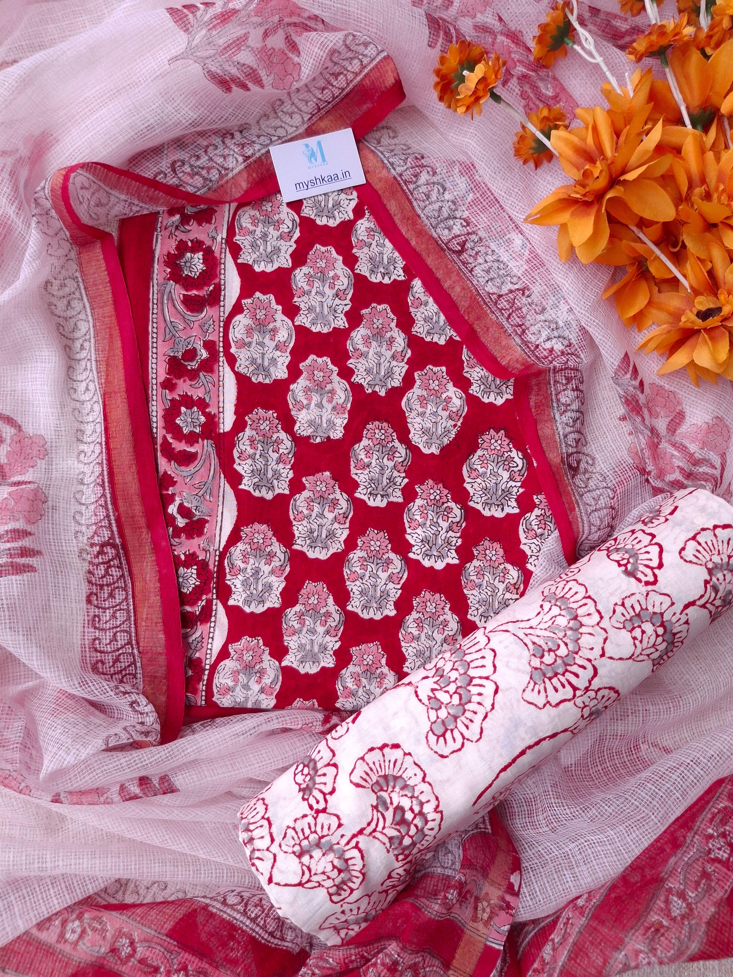 Red Cotton Handblock Office Wear Suit fabric with Kota Doria Dupatta