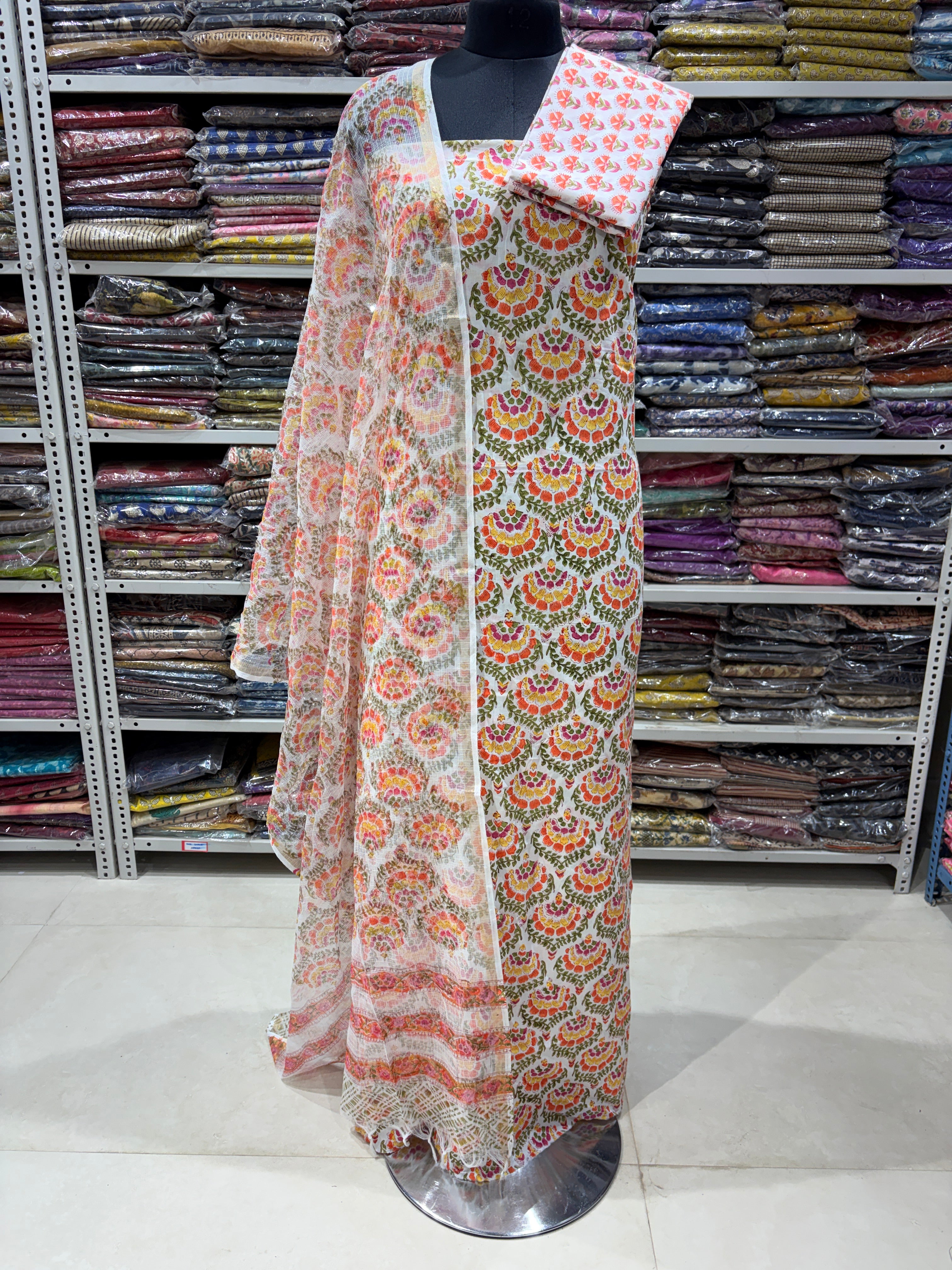 Sanganeri Print Cotton Handblock Office Wear Suit fabric with Sanganeri Kota Doria Dupatta