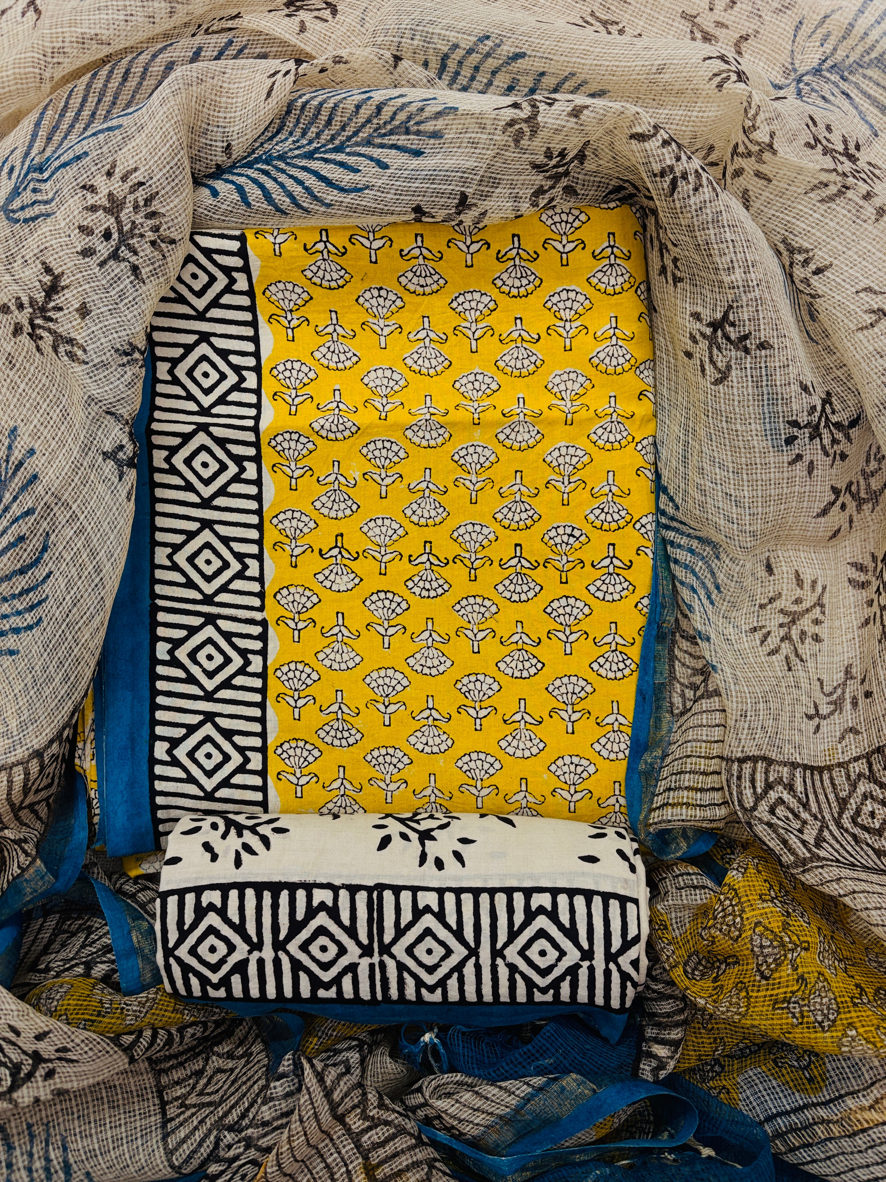 Yellow Cotton Handblock Office Wear Suit fabric with Kota Doria Dupatta