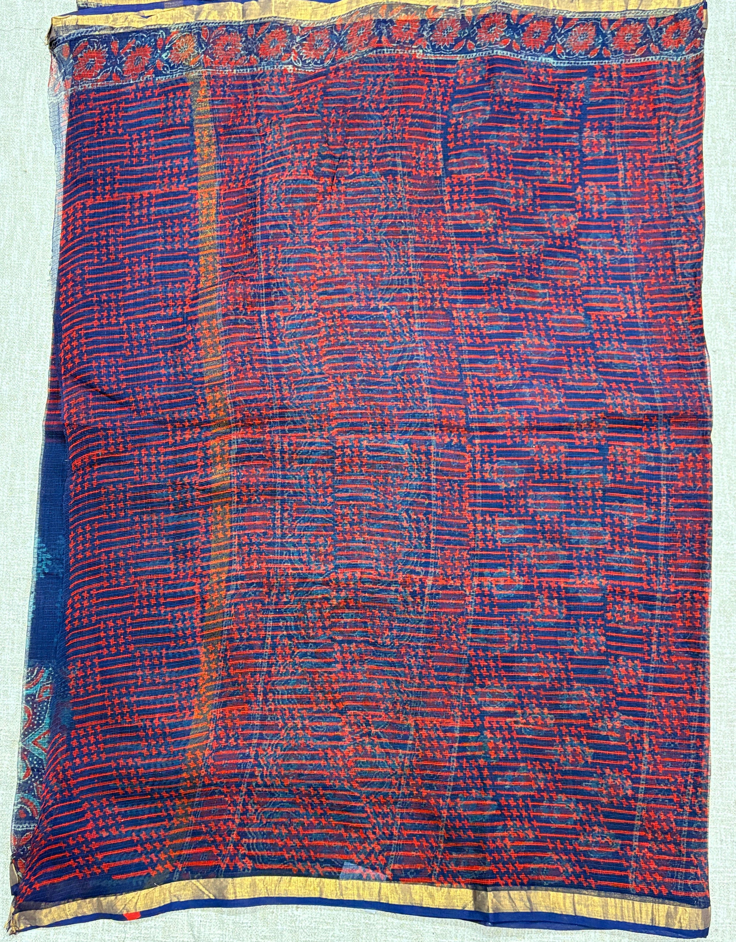 Blue Ajrakh Handblock Print Kota Doria Saree with blouse piece(Lining Included)