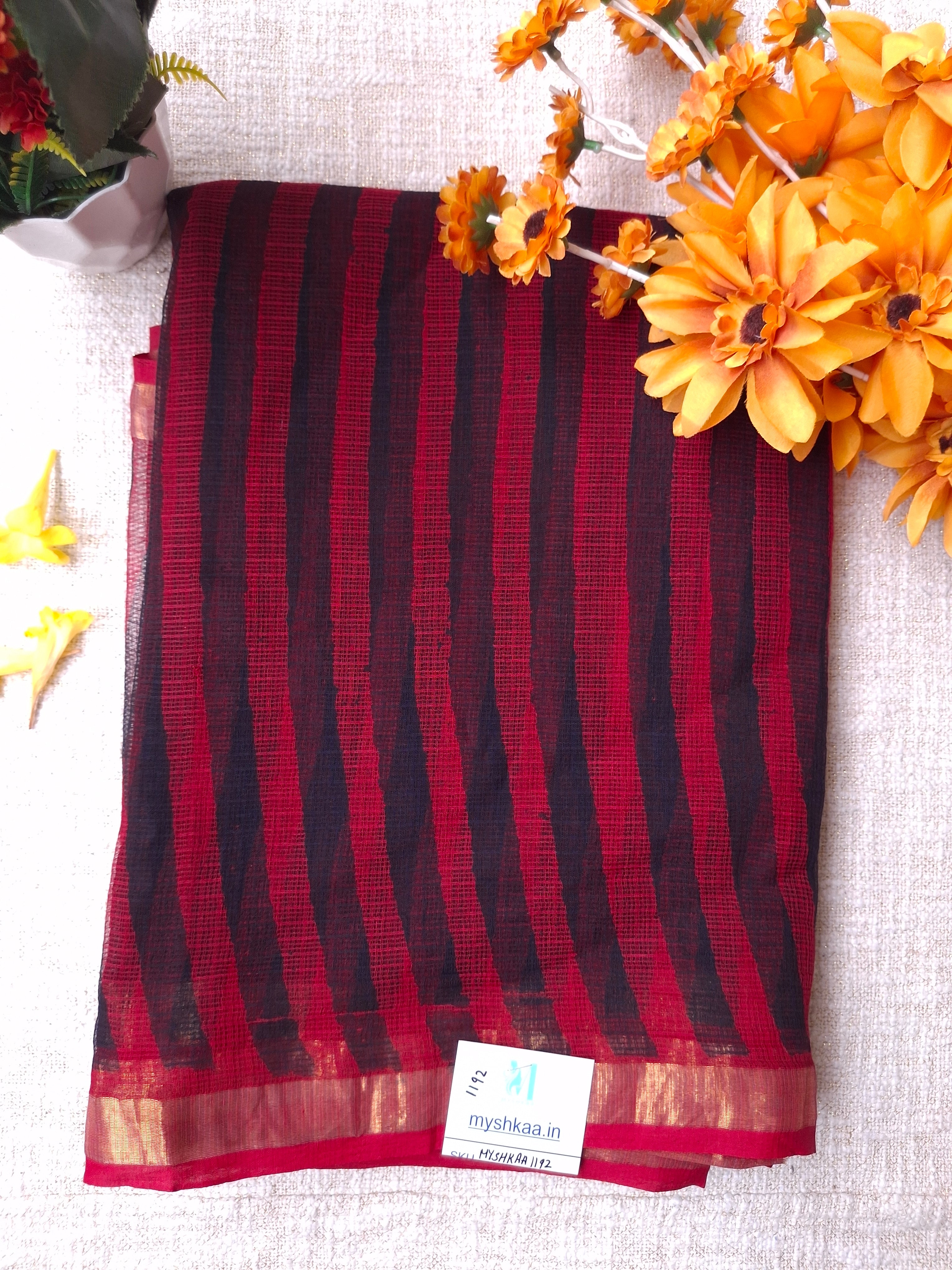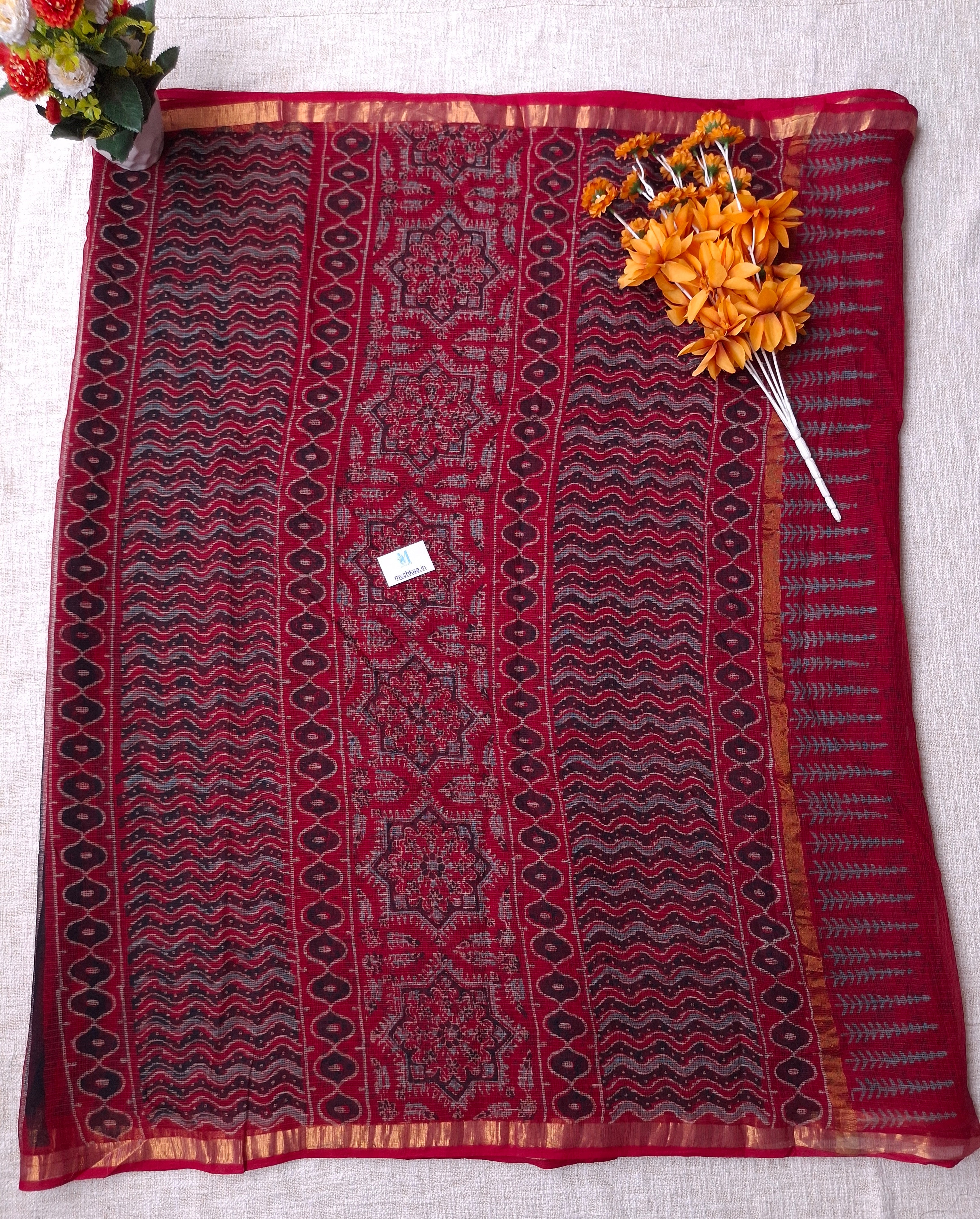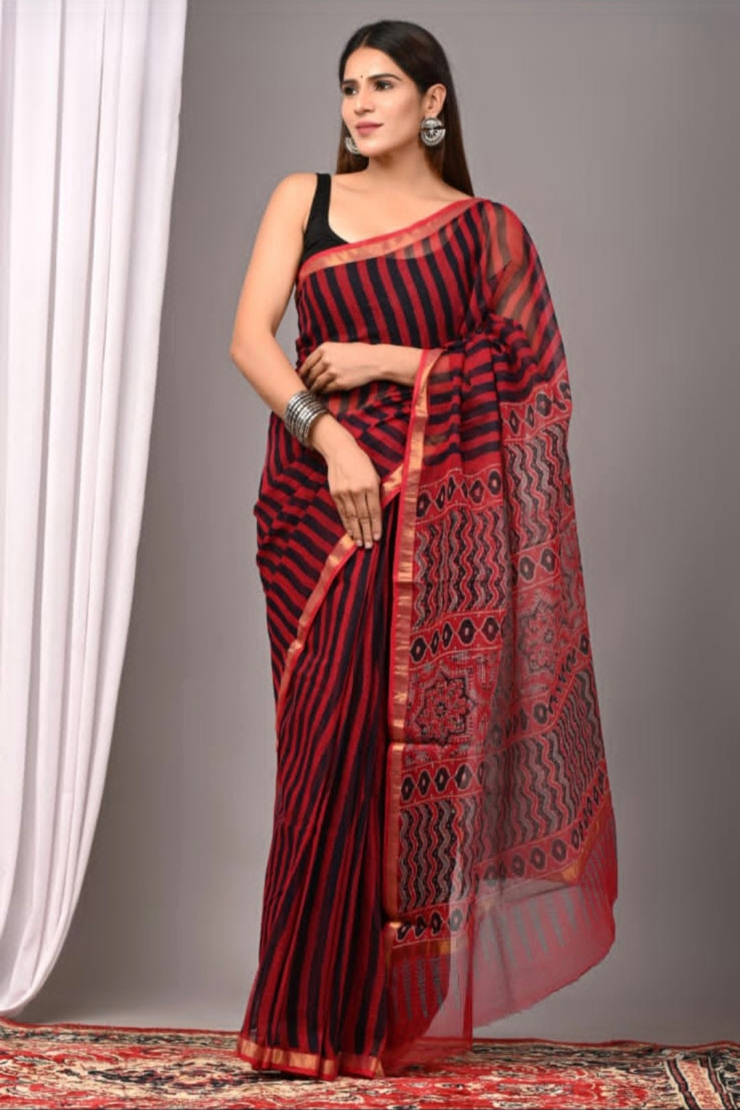 Ajrakh Handblock Print Kota Doria Cotton Saree with Zari border and Unstitched Blouse Piece