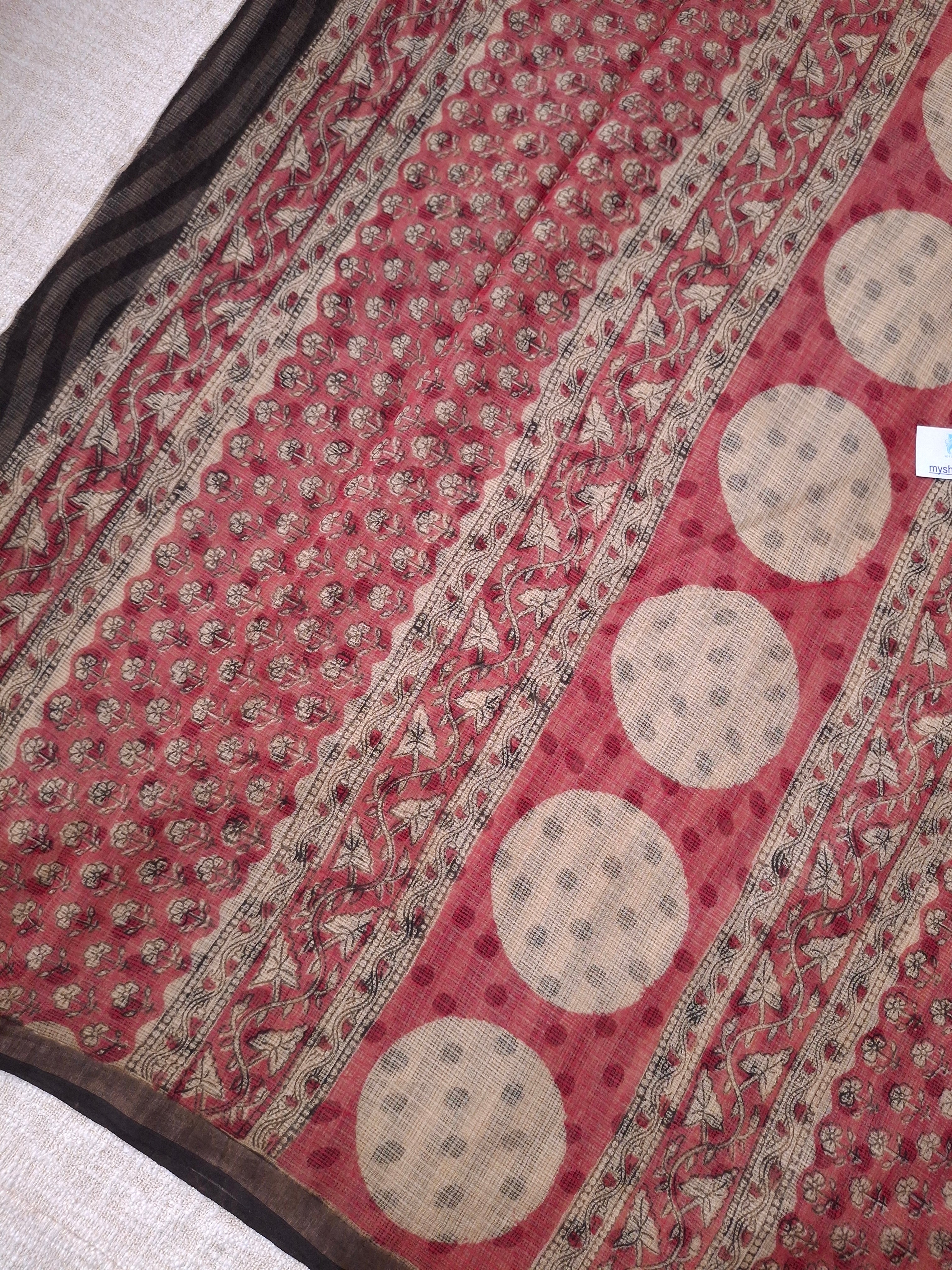 Ajrakh Handblock Print Kota Doria Cotton Saree with Zari border and Unstitched Blouse Piece
