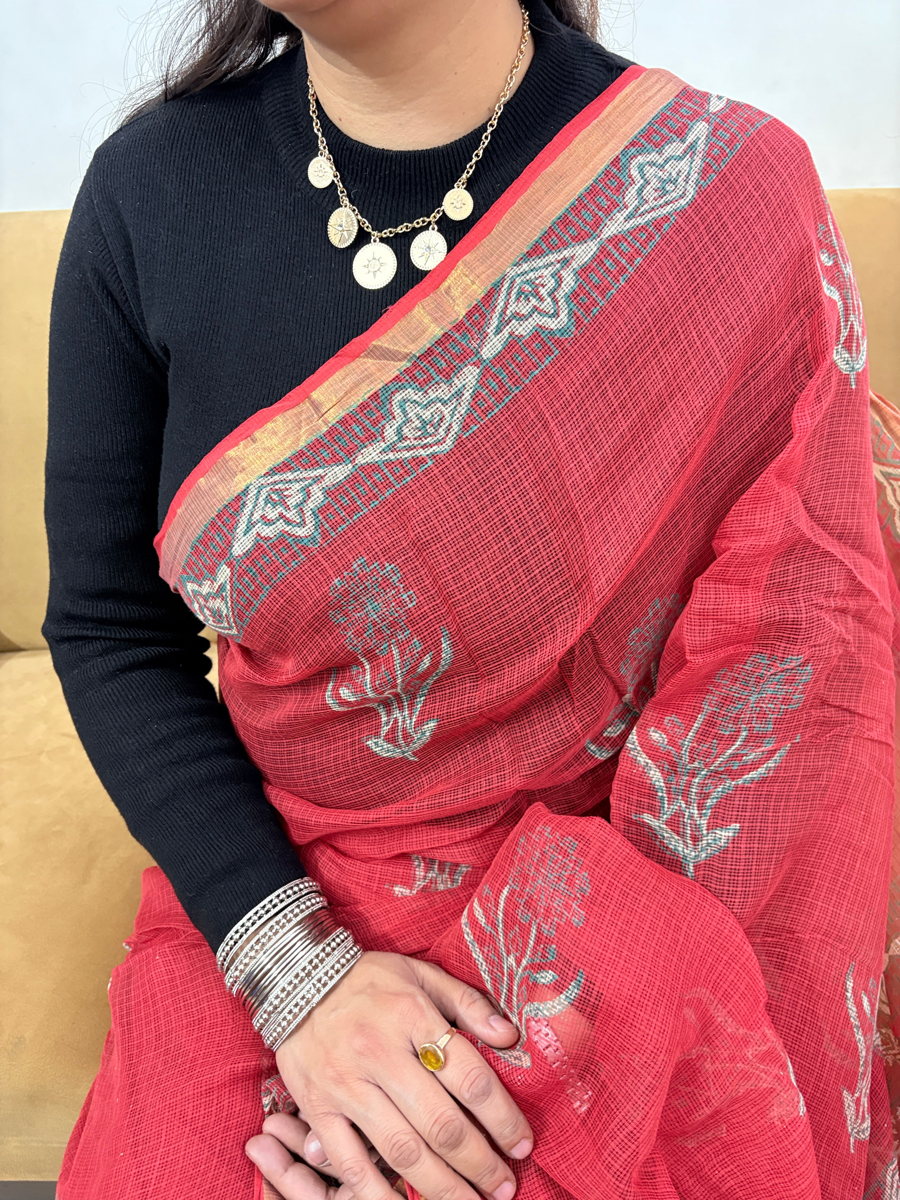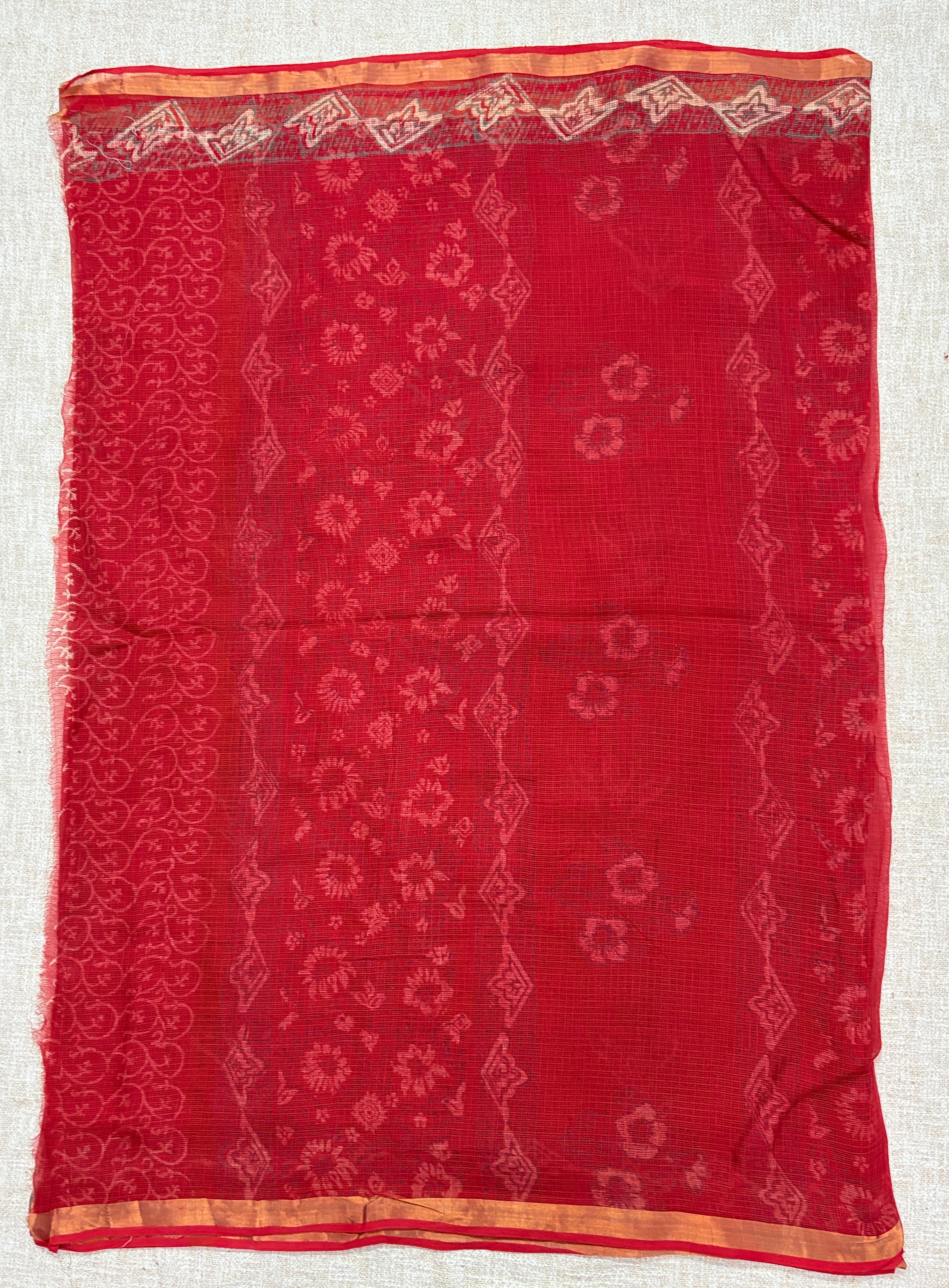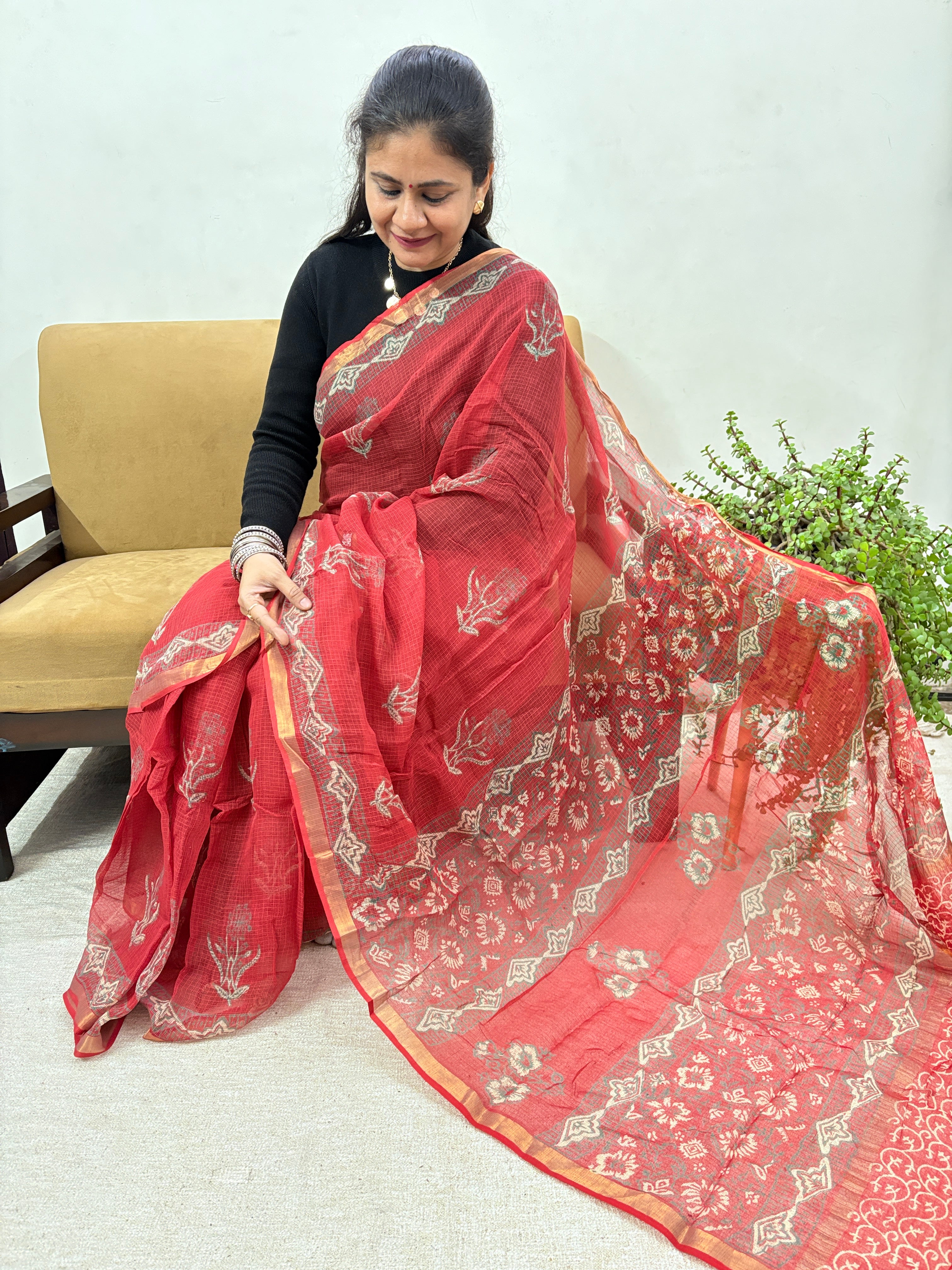 Handblock Print Kota Doria Cotton Saree with Zari border and Unstitched Blouse Piece(Lining Included)