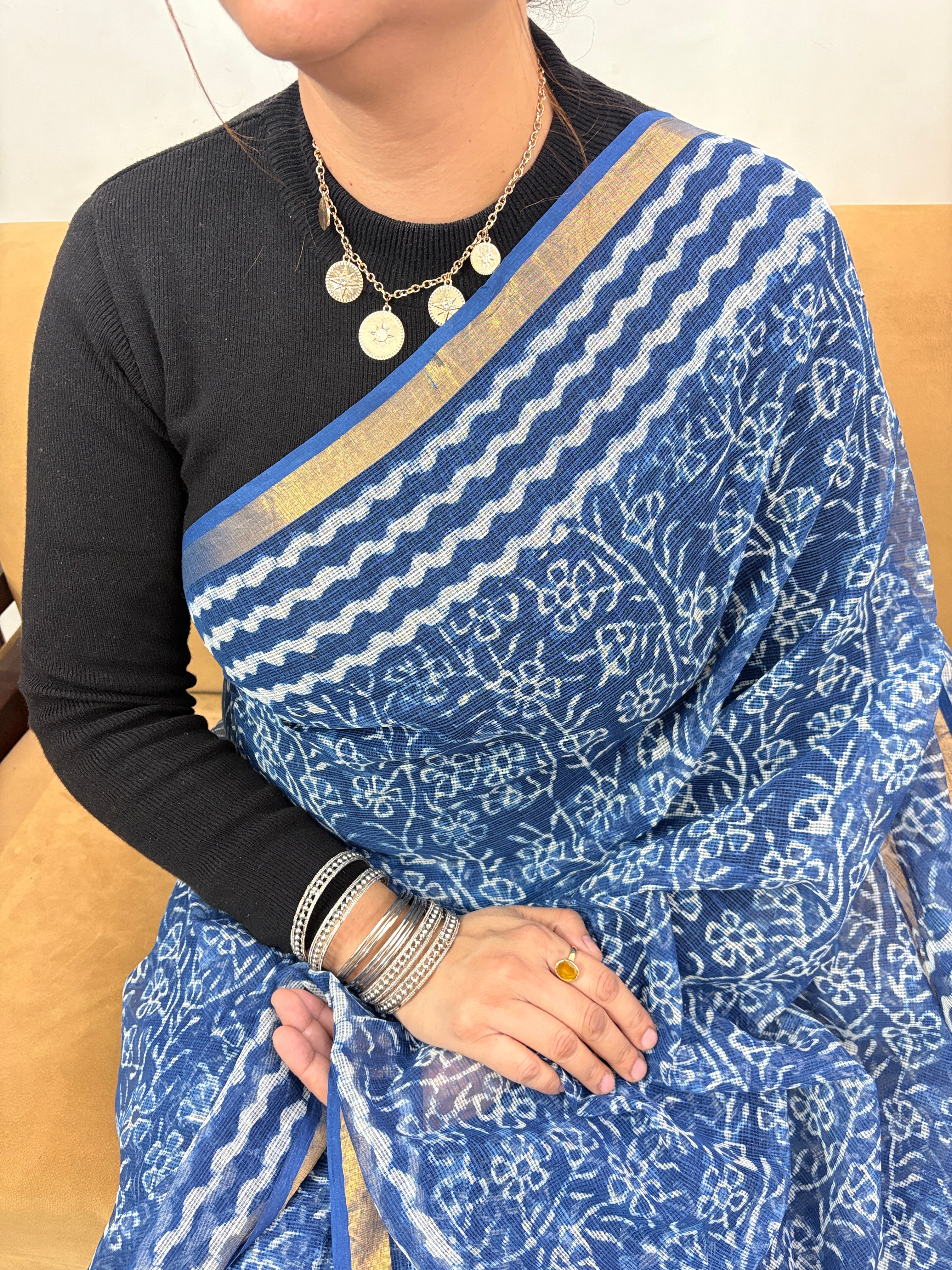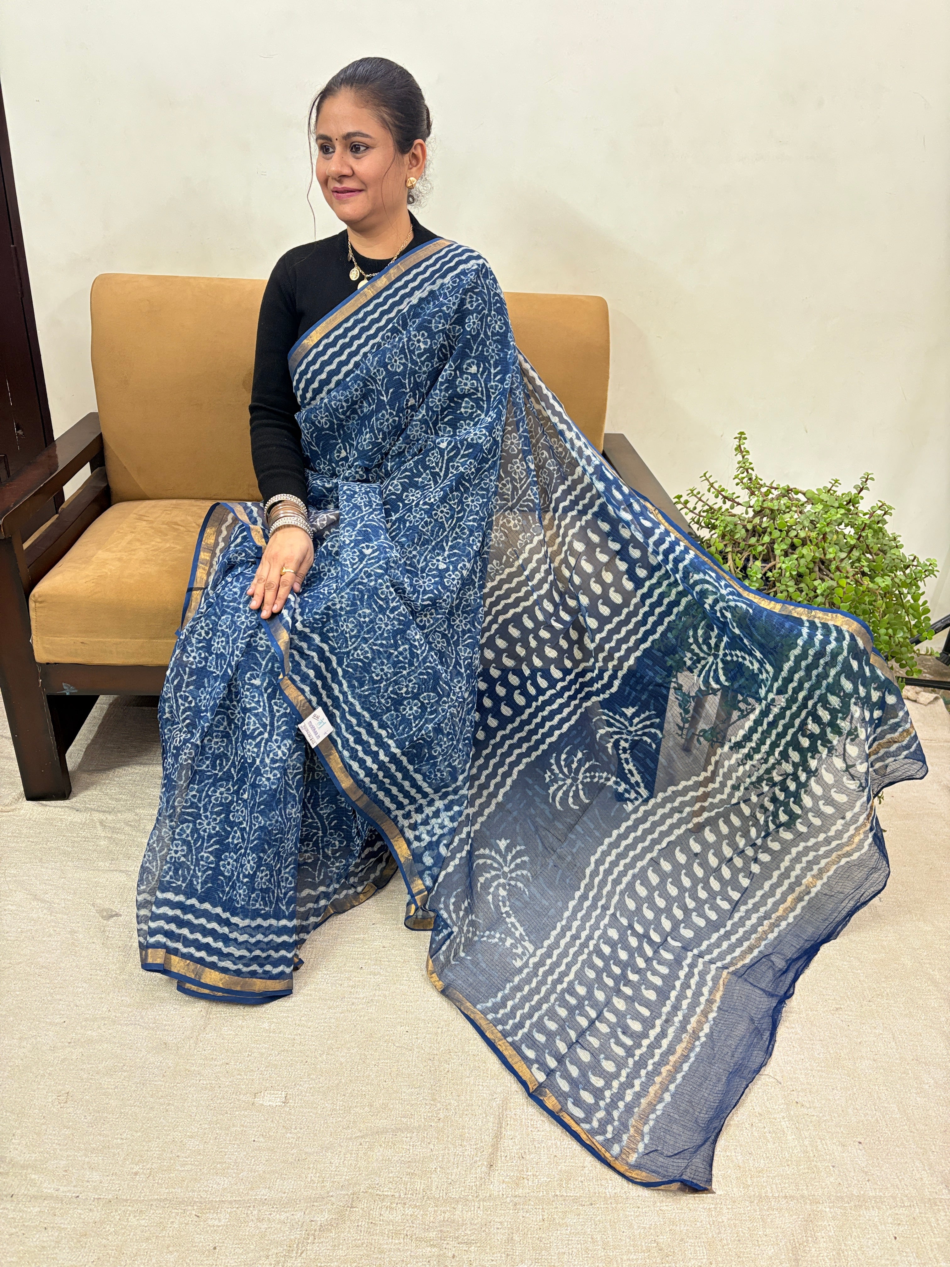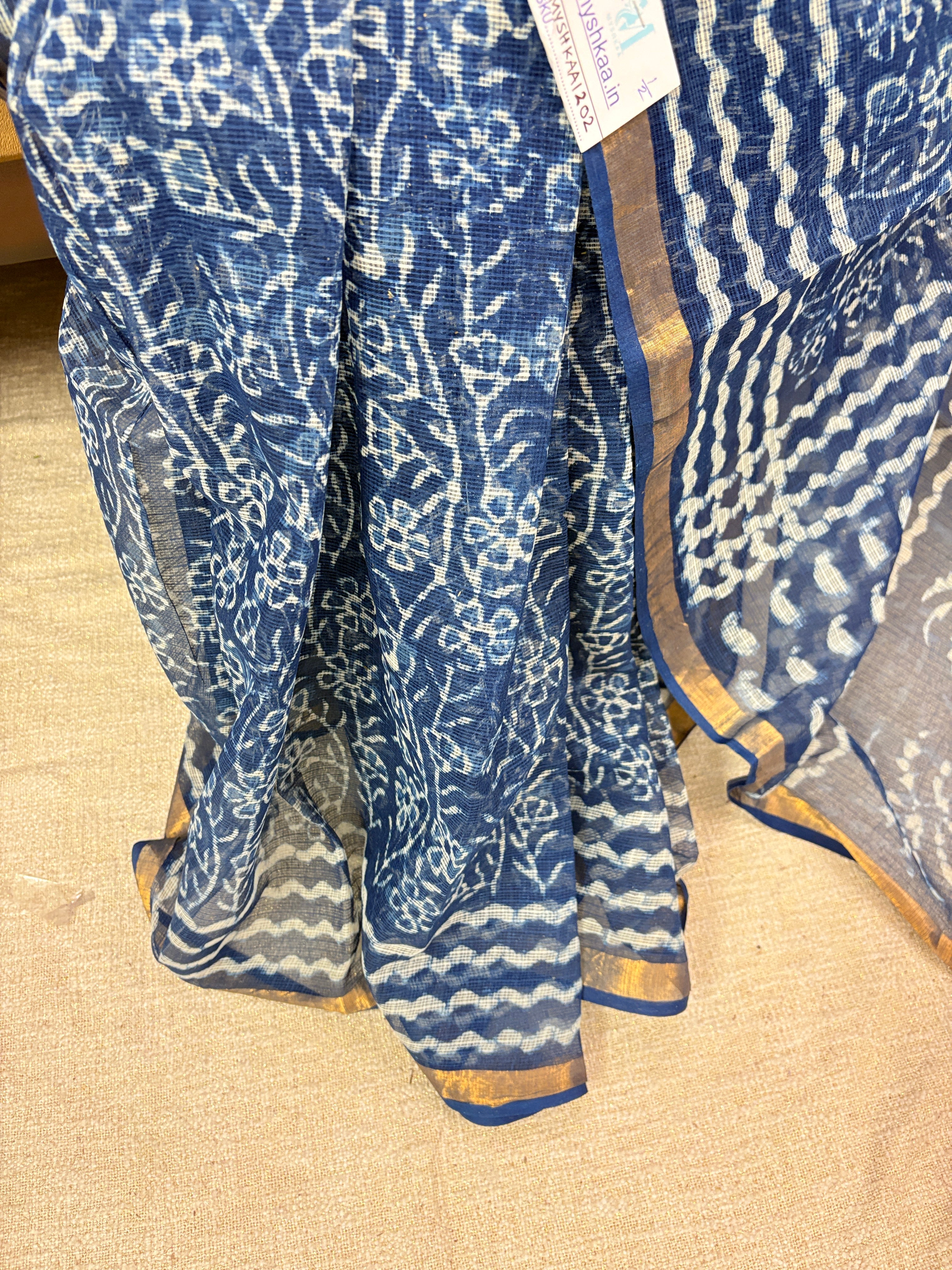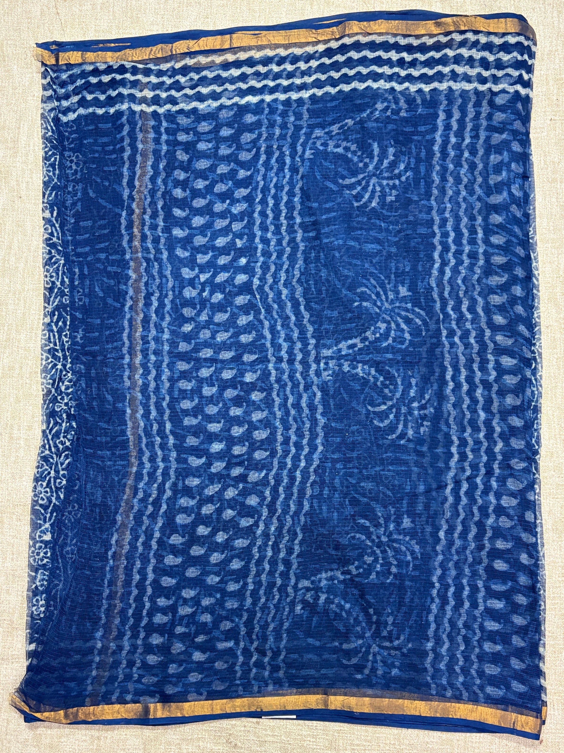 Handblock Print Kota Doria Cotton Saree with Zari border and Unstitched Blouse Piece(Lining Included)