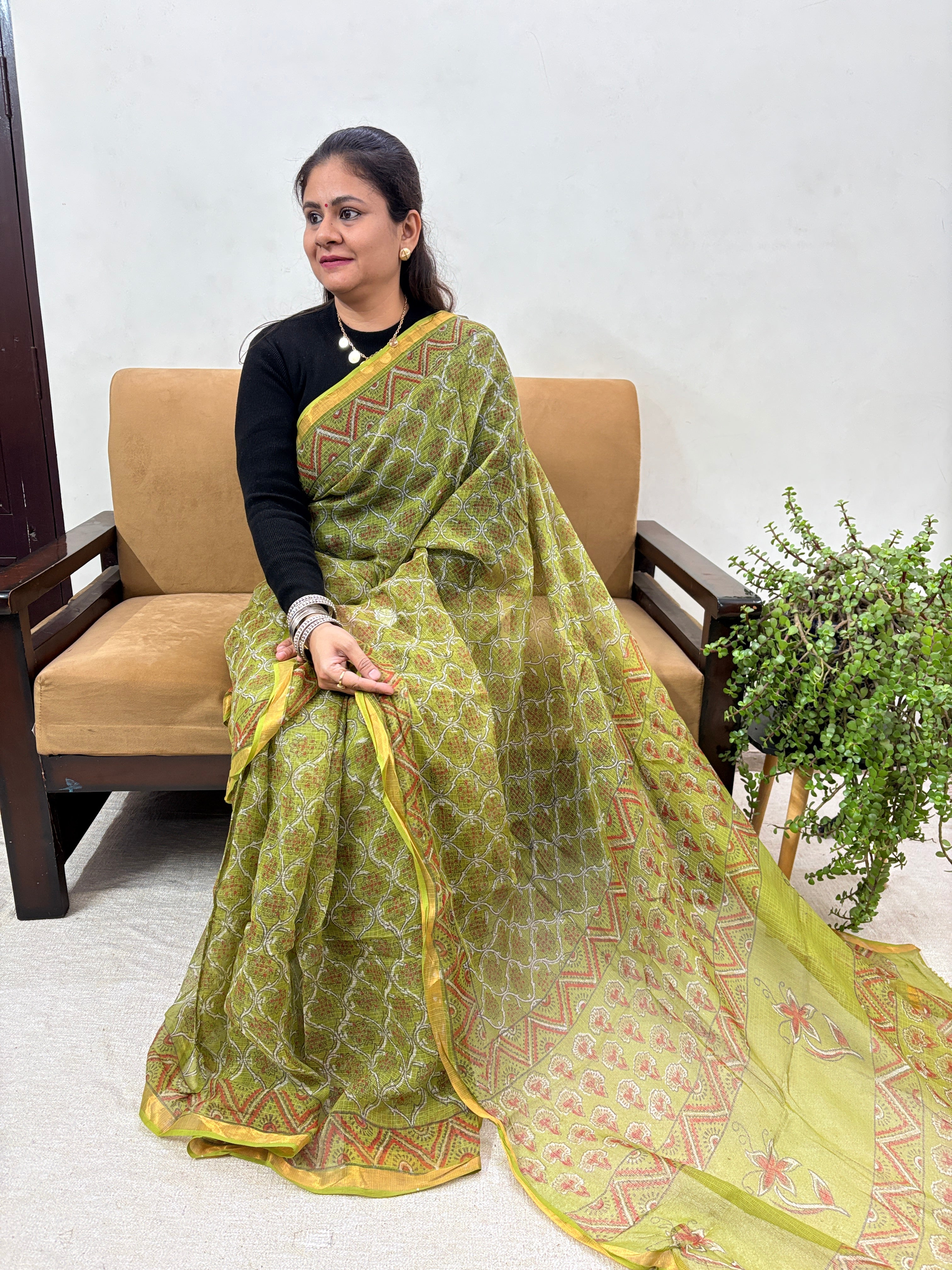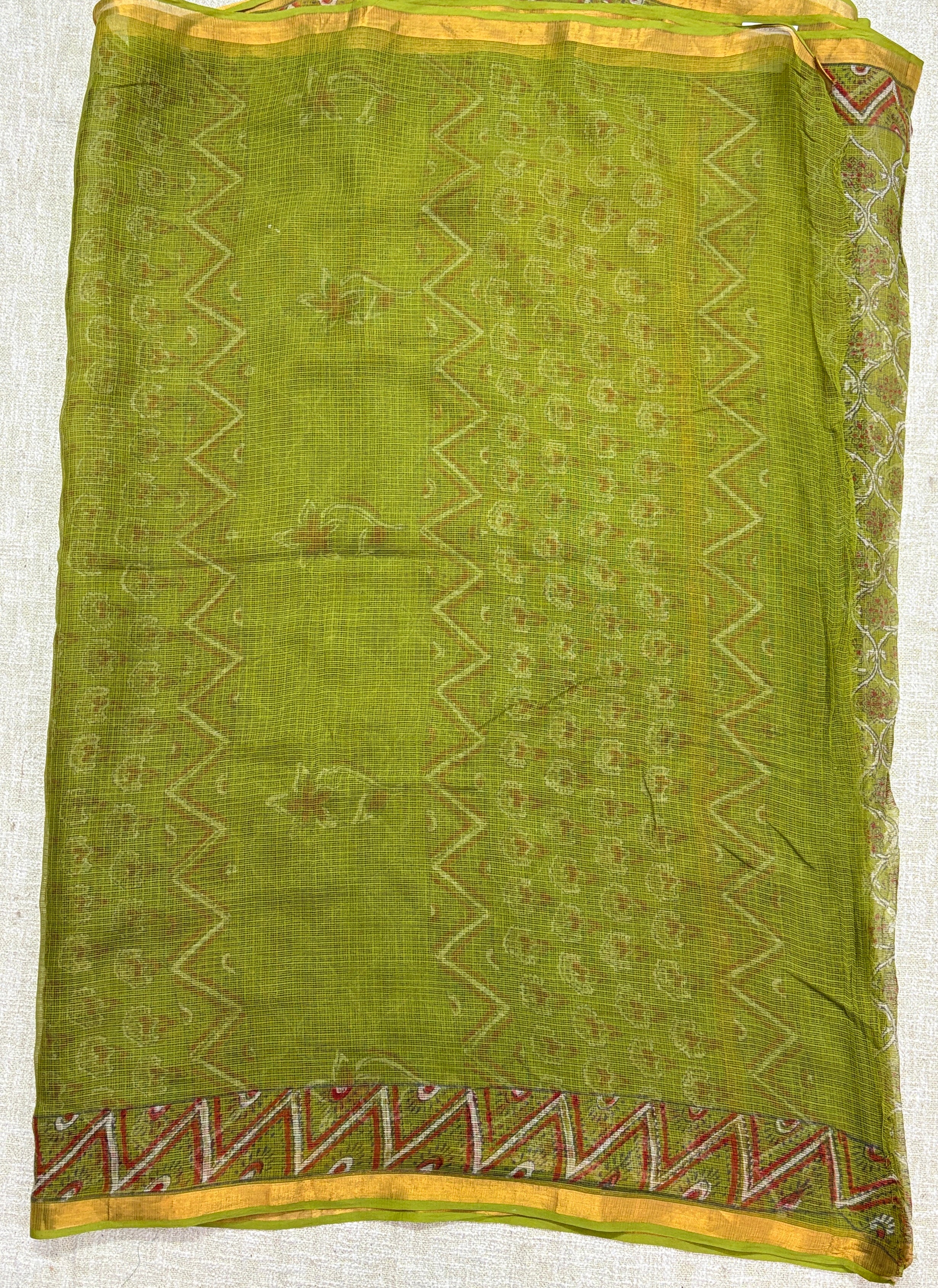 Olive Green Kota Doria Cotton Saree with Unstitched Blouse Piece