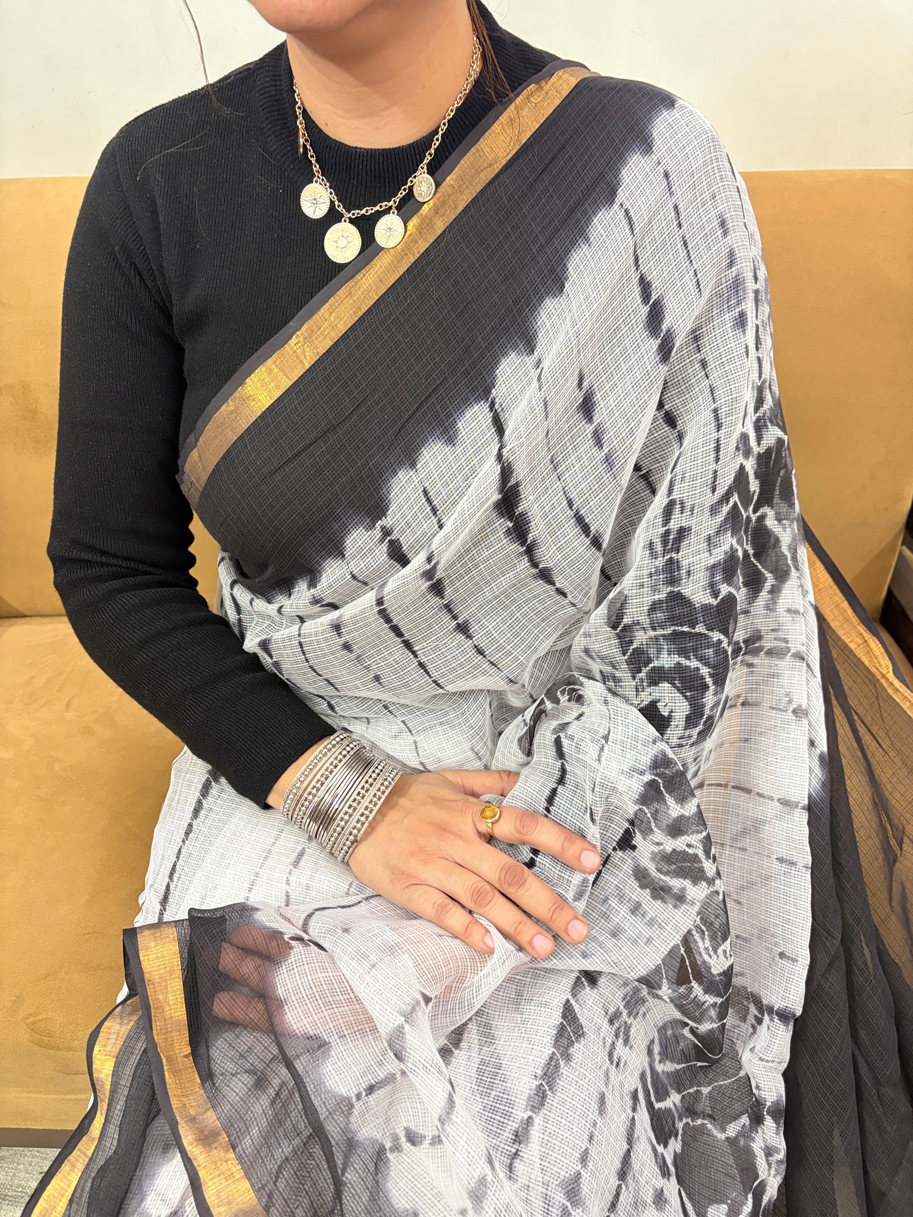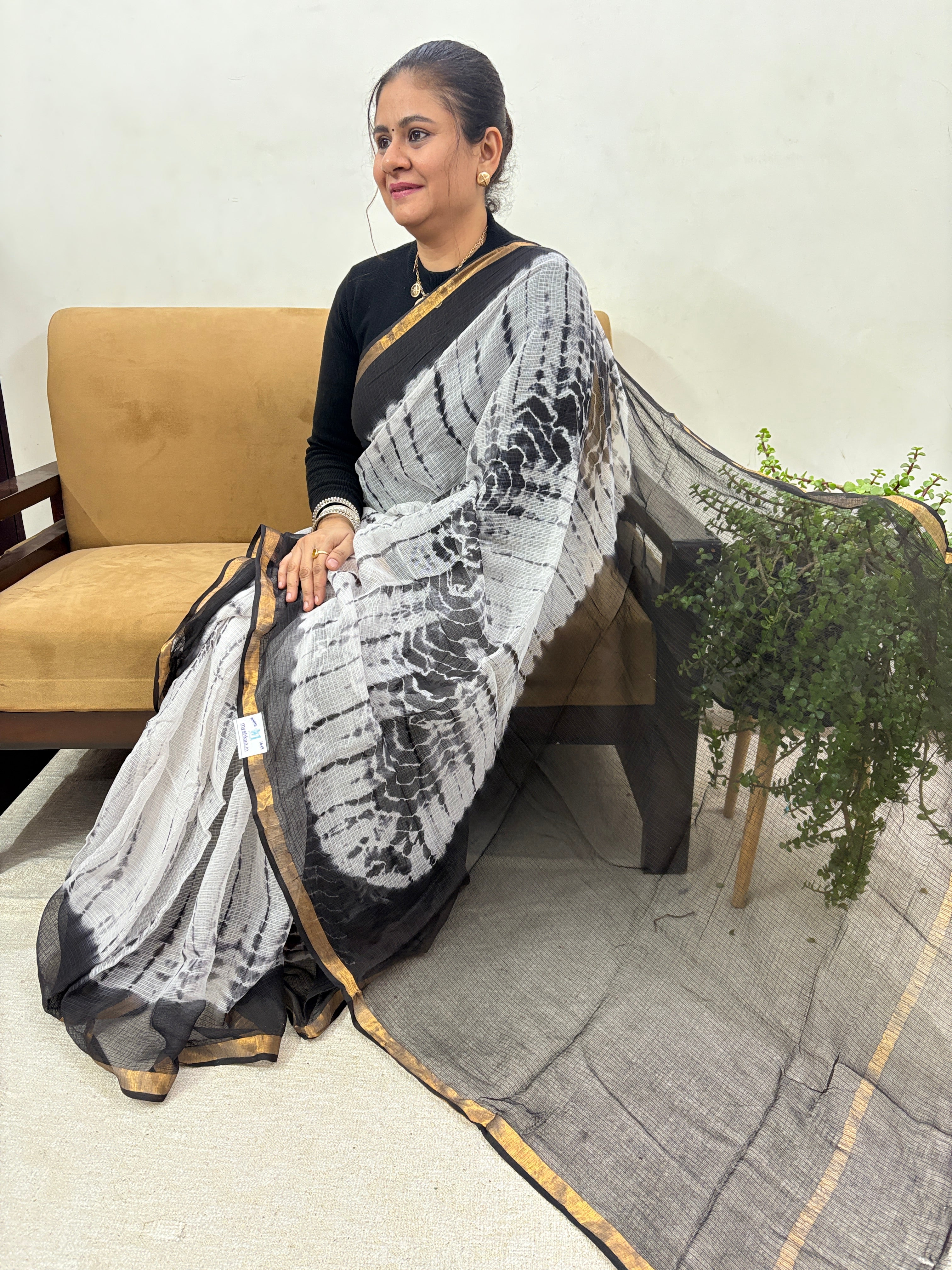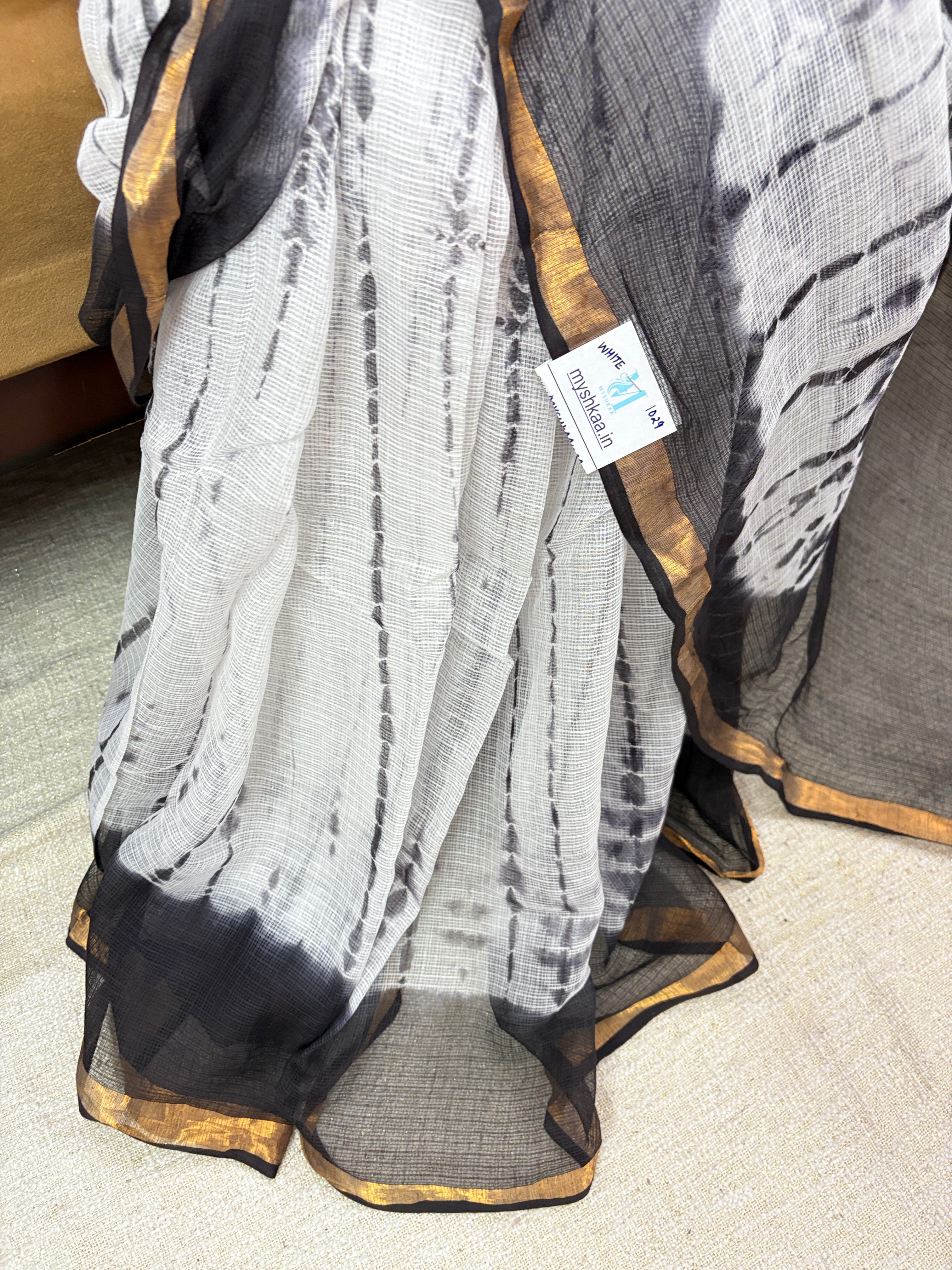 Shibori Tie & Dye White Kota Doria Cotton Saree with Unstitched Blouse Piece