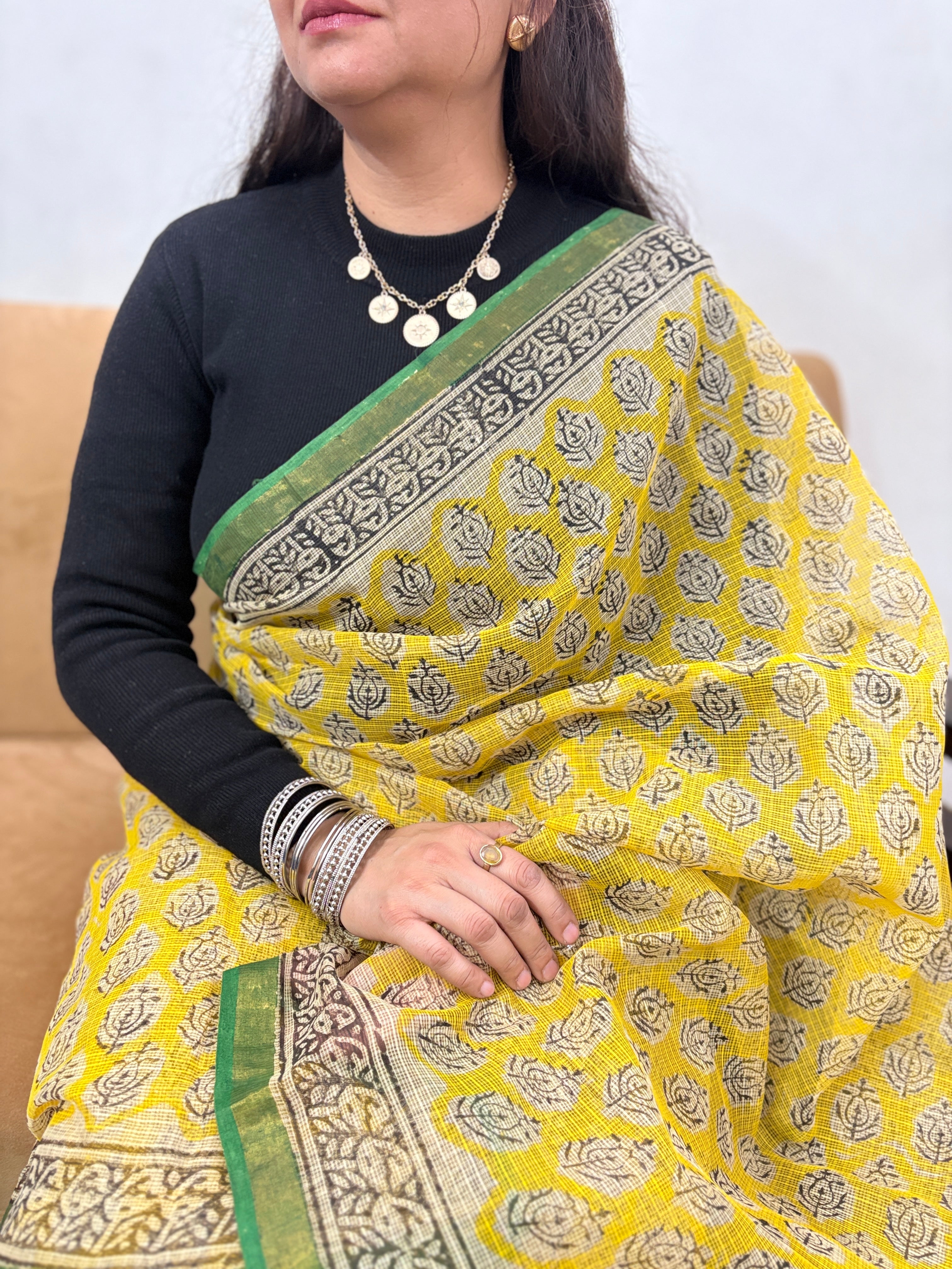 Yellow Hand Block Printed Kota Doria Cotton Saree with Unstitched Blouse Piece(Lining Included)