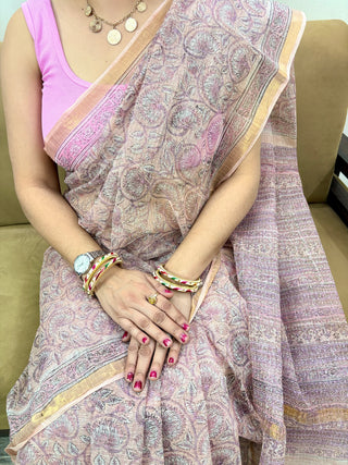 Handblock Print Kota Doria Saree with Zari Border and Unstitched Blouse Piece(Lining Included)