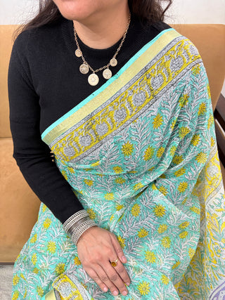 Light Green Hand Block Print Kota Doria Cotton Saree with Unstitched Blouse Piece(Lining Included)