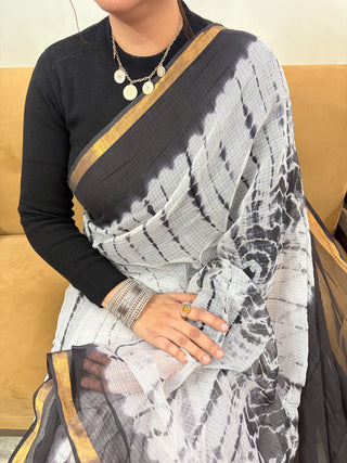 Shibori Handblock Print Kota Doria Cotton Saree with Zari border and Unstitched Blouse Piece(Lining Included)