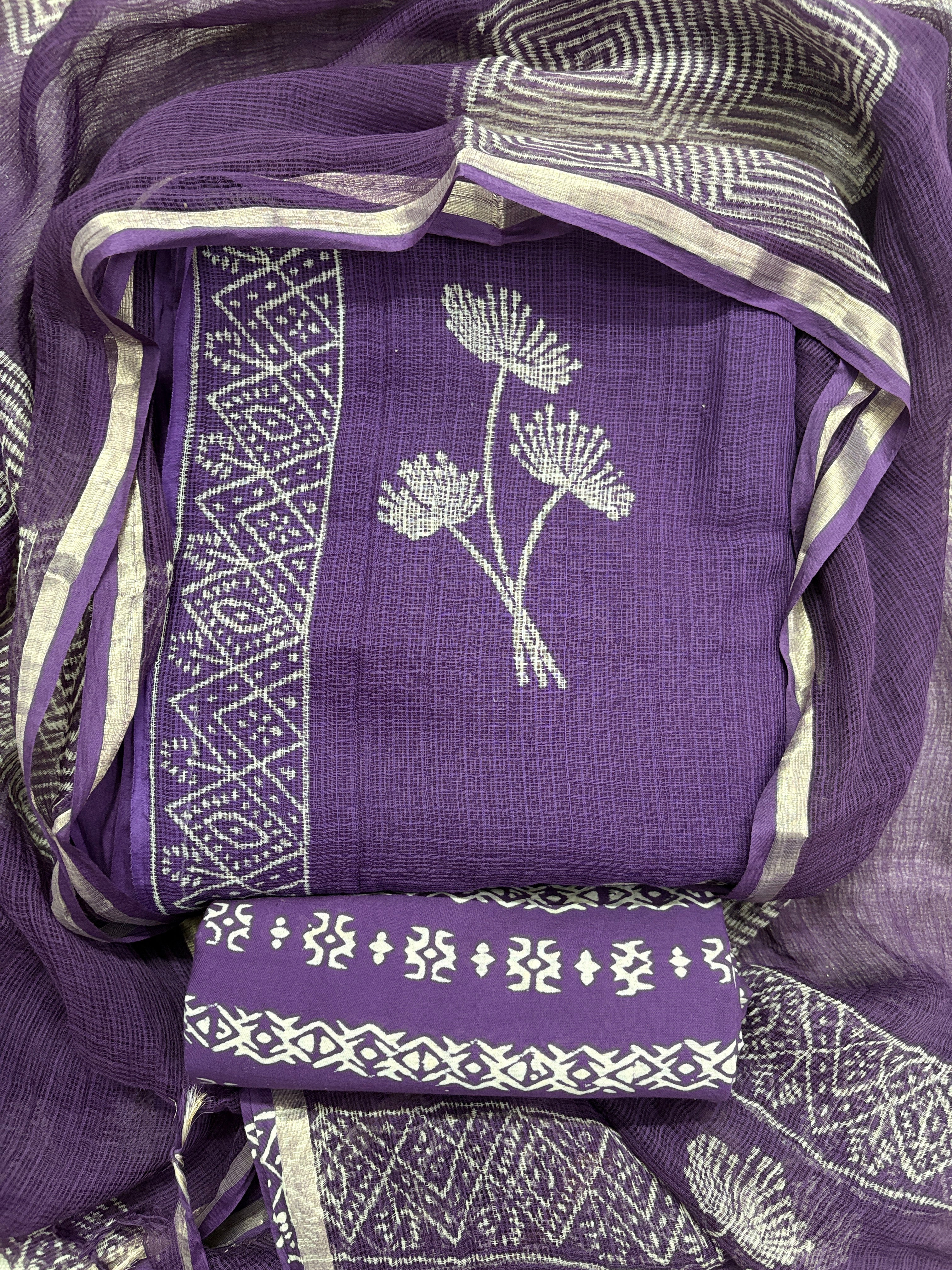 • This 3 piece purple Kota Doria suit fabric with dupatta is a perfect gift for women and girls for all occasions. It can be used at functions, ceremonies, weddings or office purpose