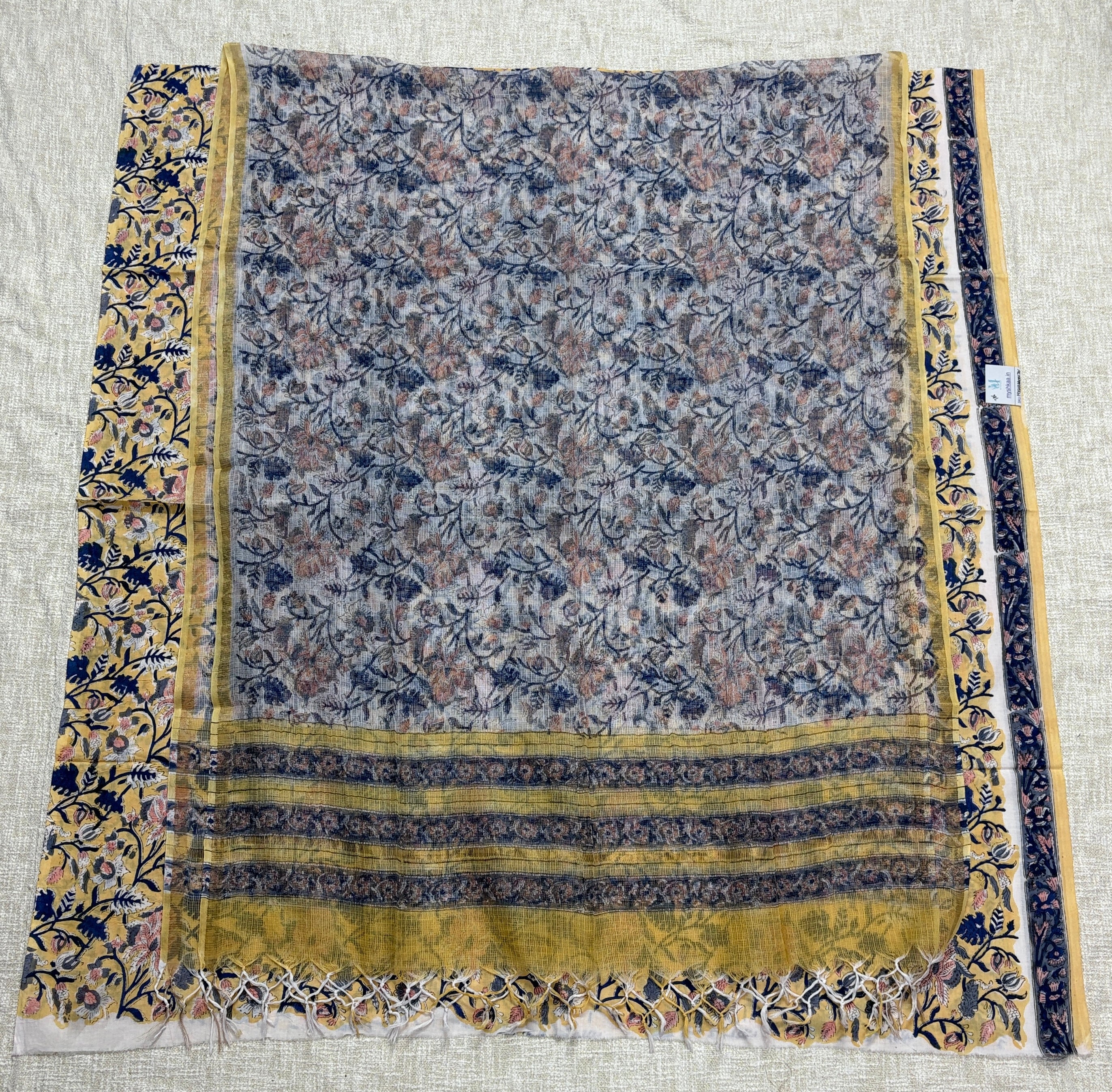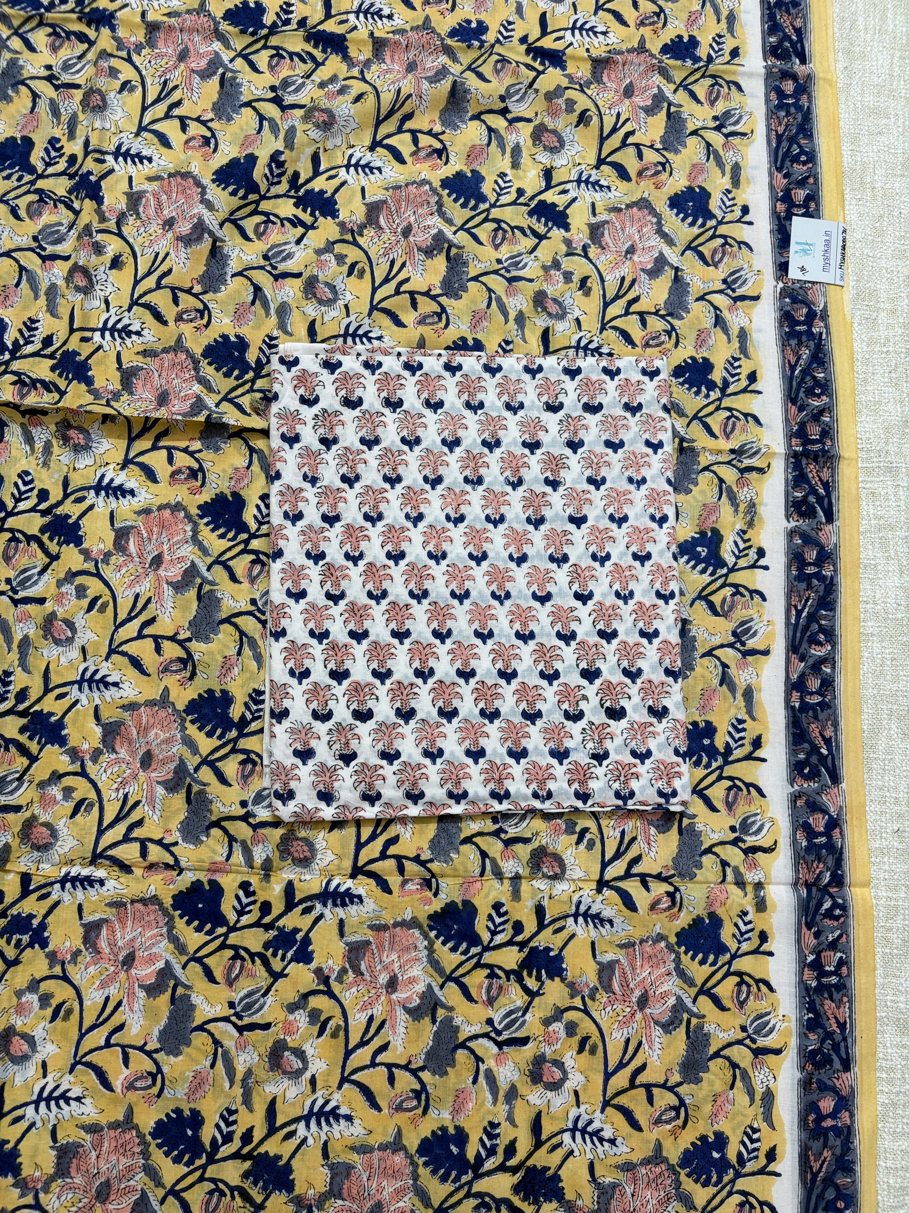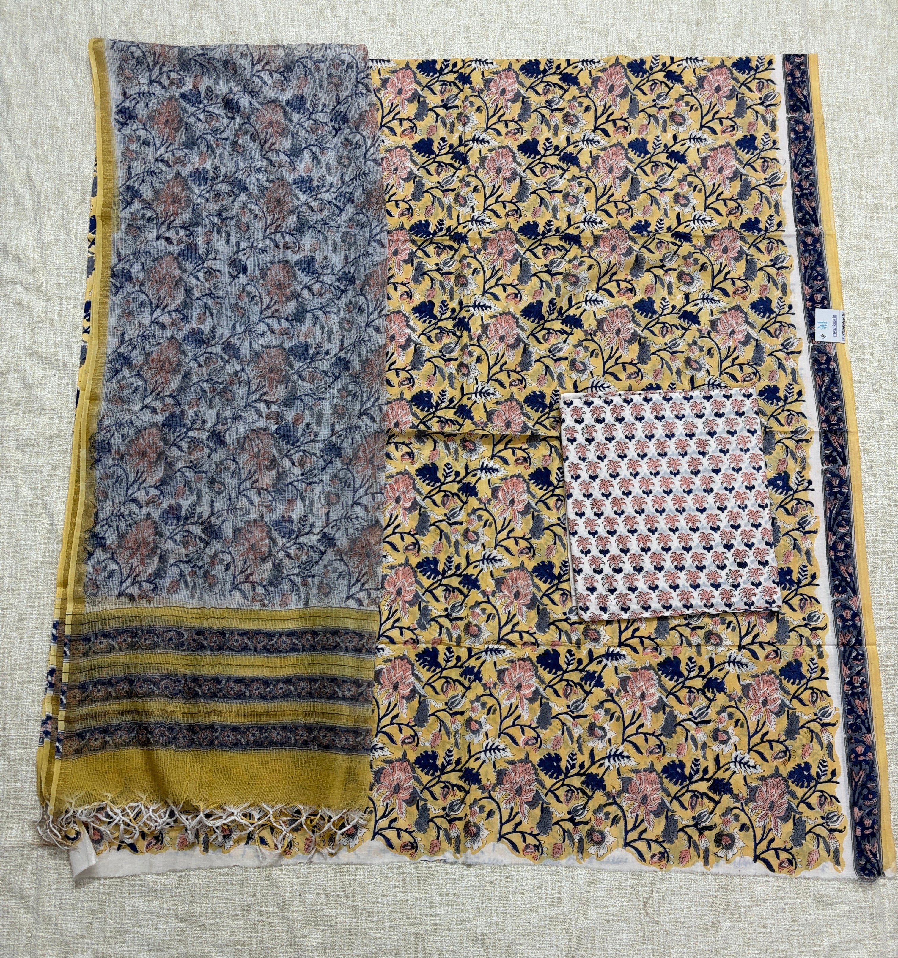 Light Yellow Cotton Handblock Office Wear Suit fabric with Kota Doria Dupatta