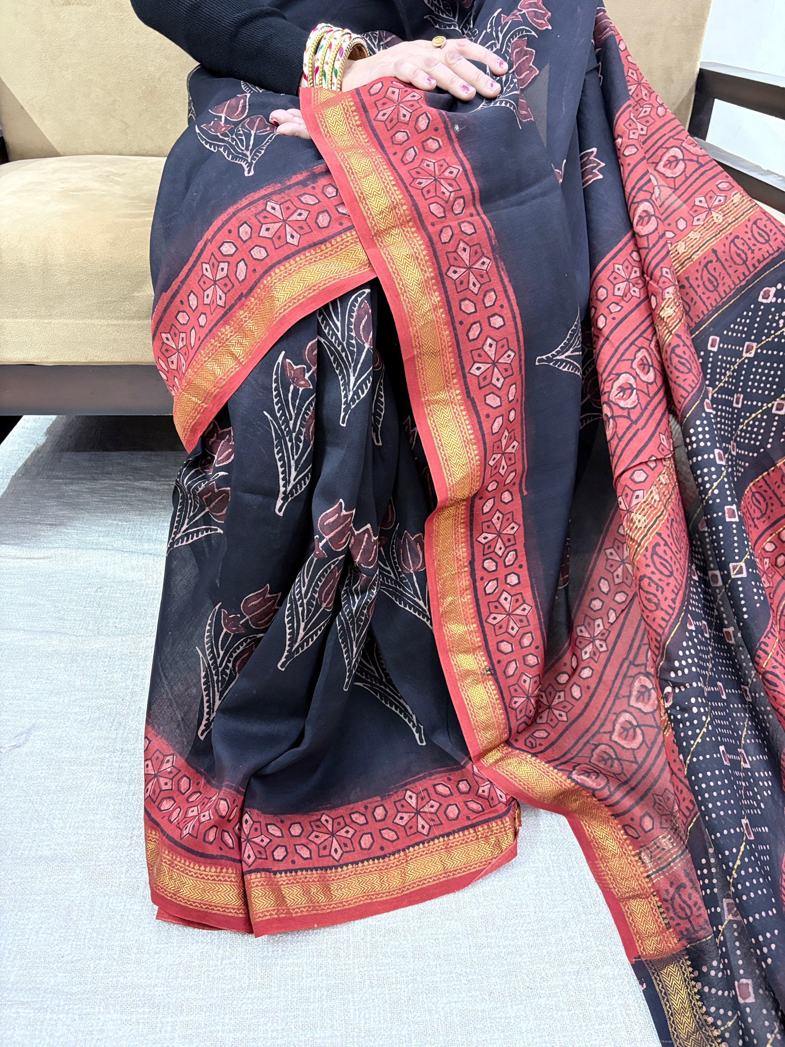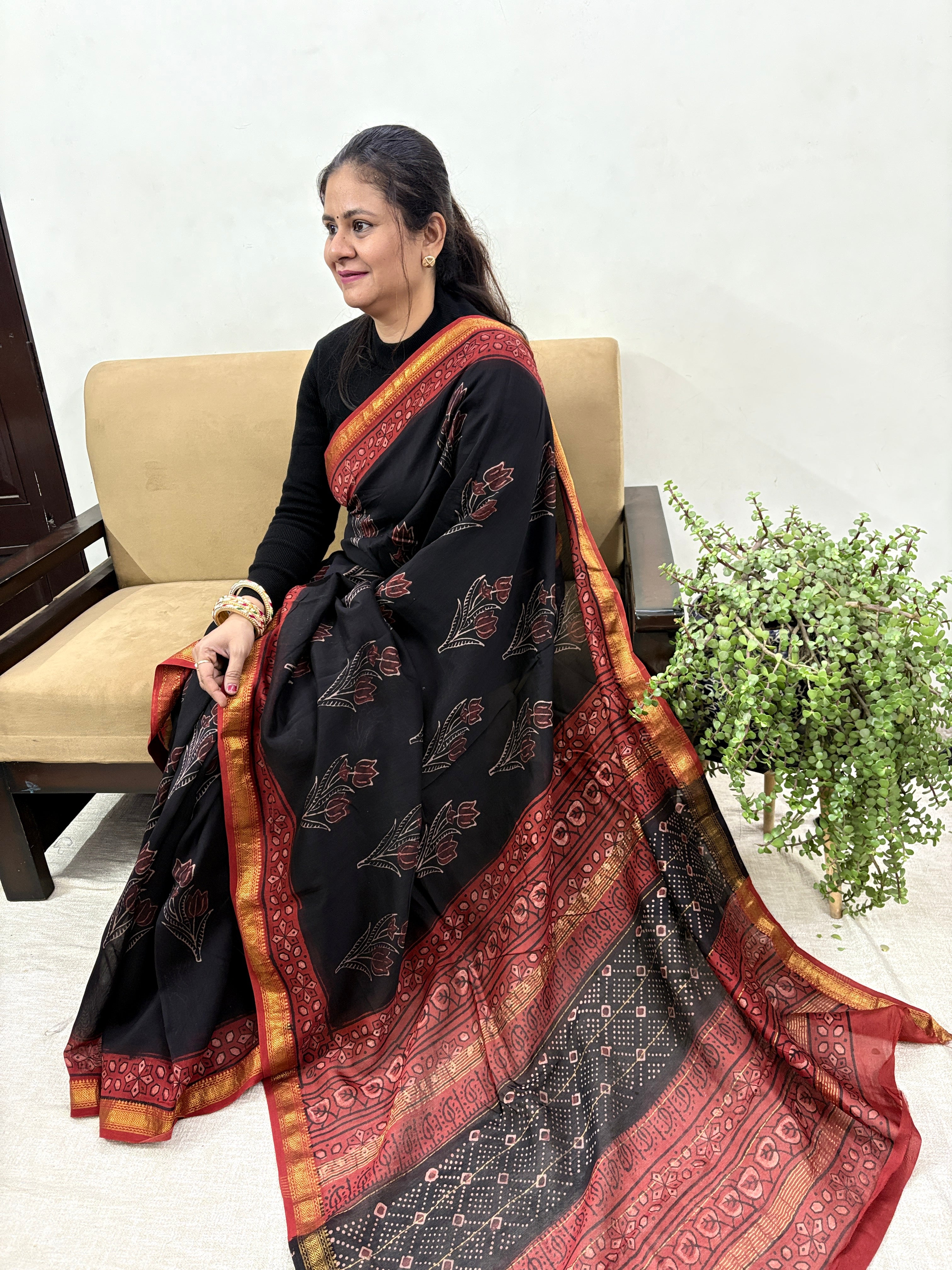 Ajrakh Print Maheshwari Silk Saree with Unstitched Blouse Piece (Lining Included)