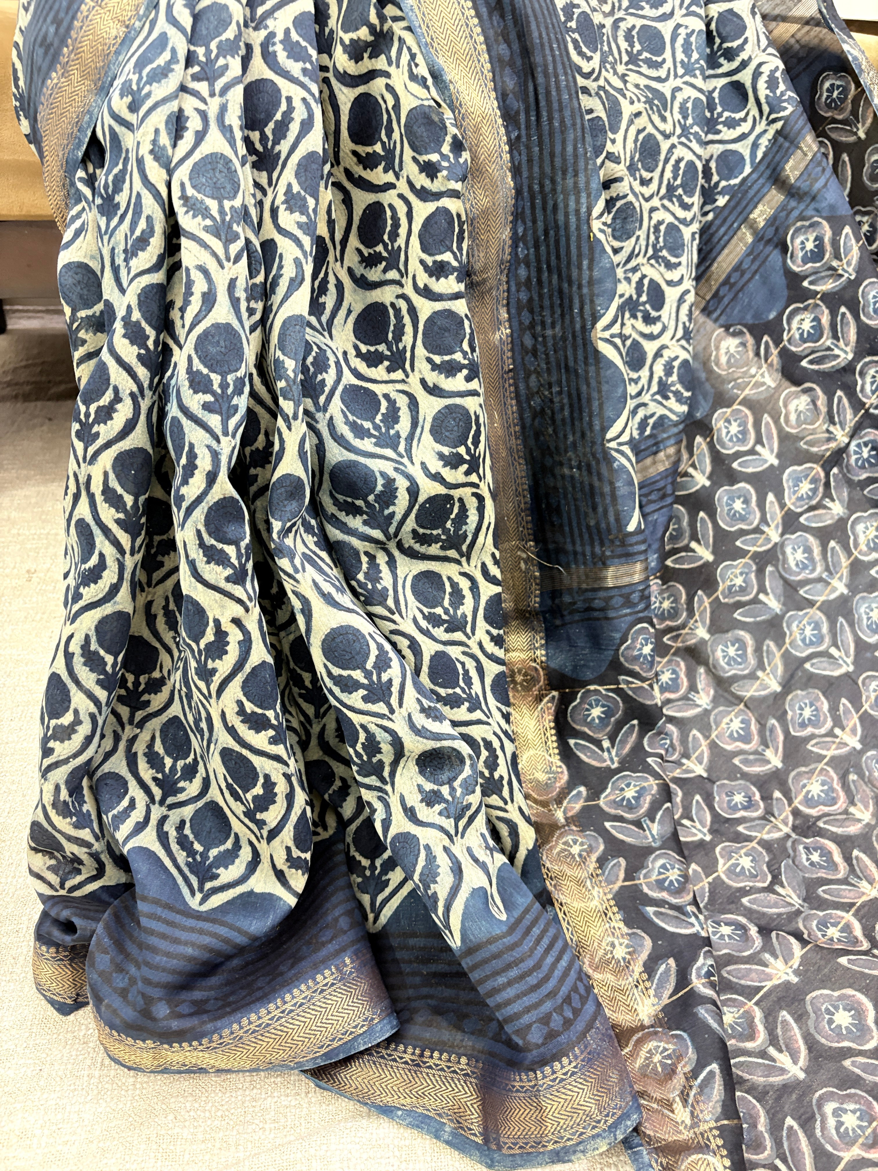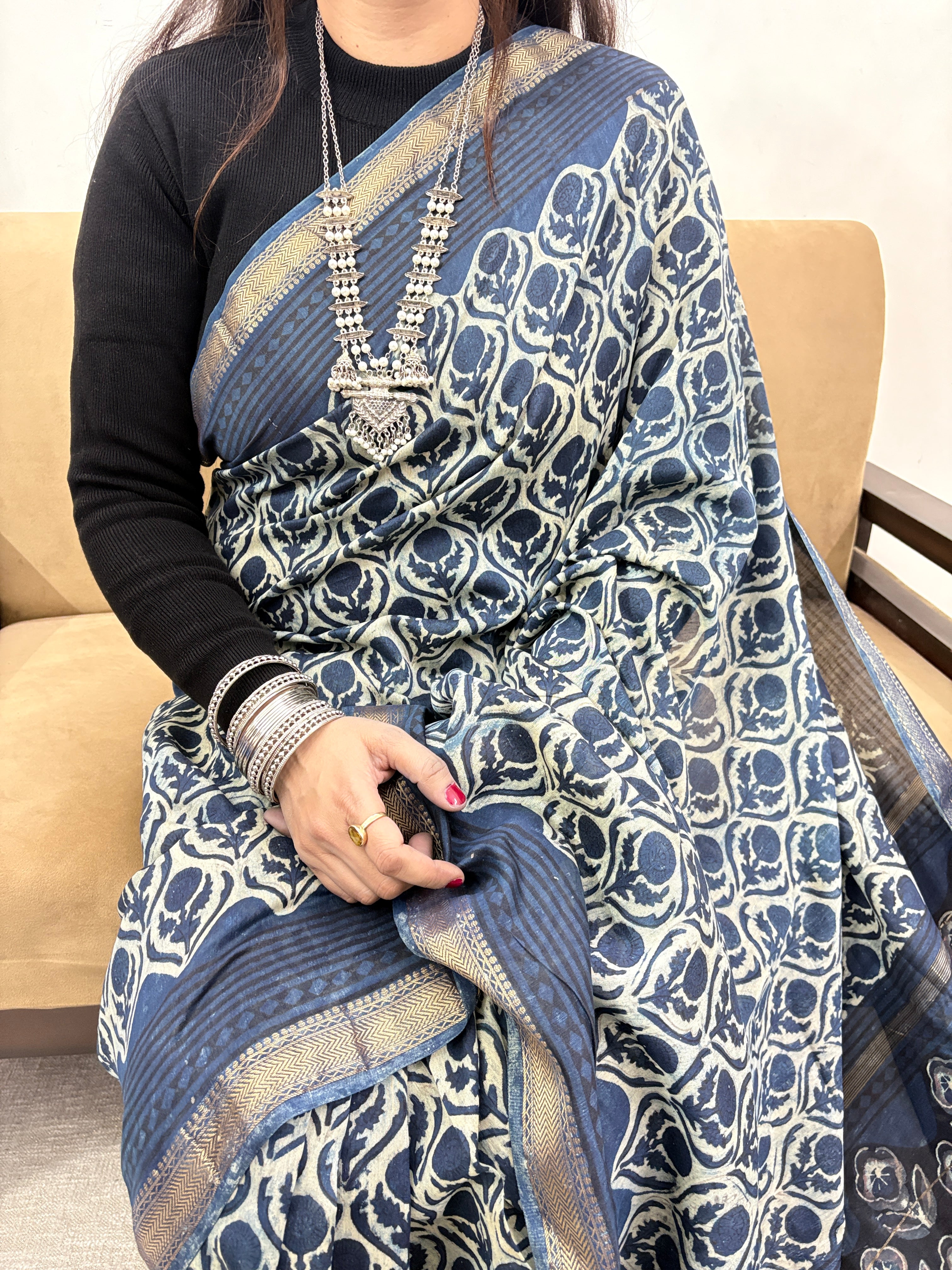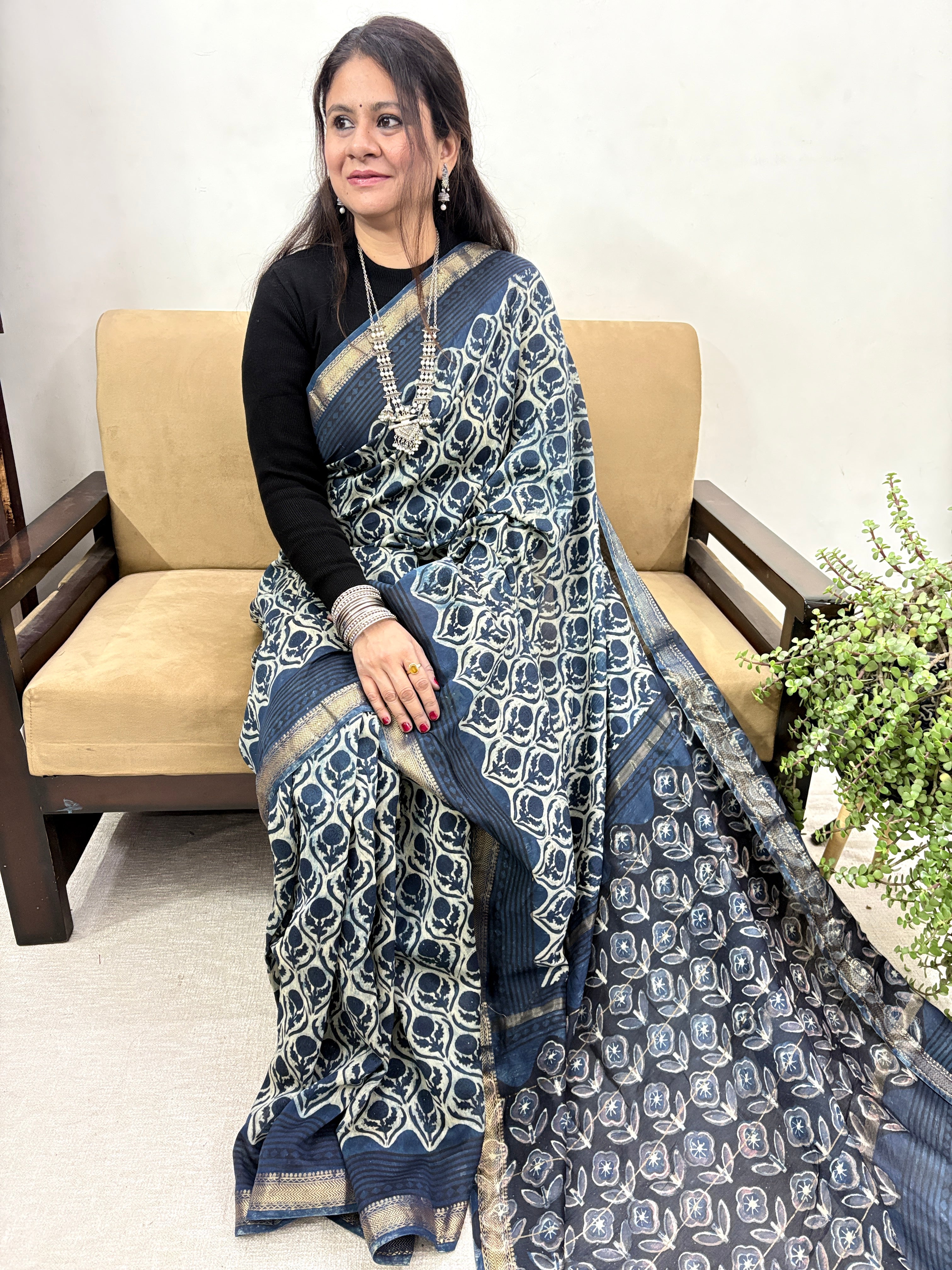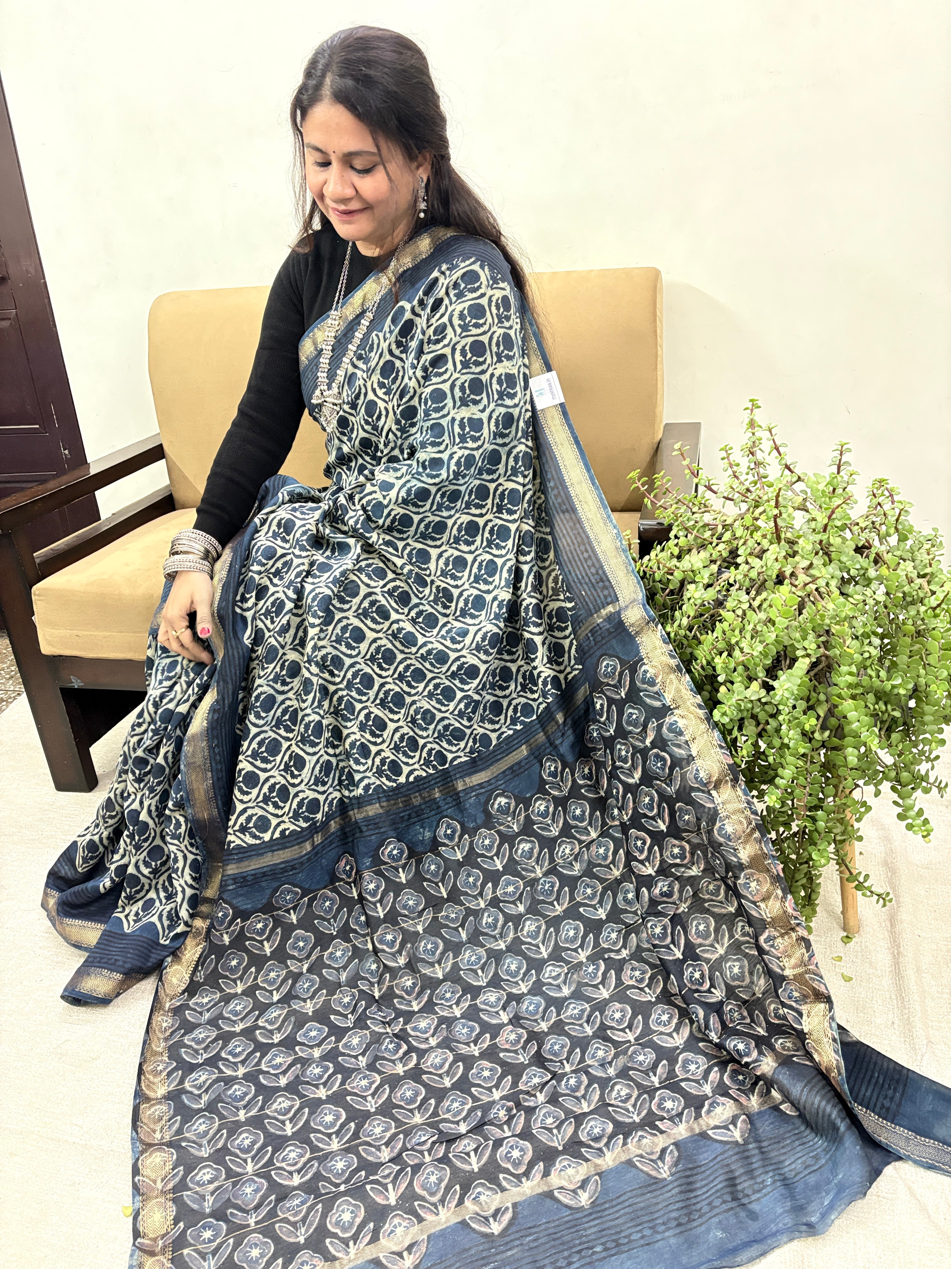 Vanaspati Ajrakh Maheshwari Silk Saree with Unstitched Blouse Piece (Lining Included)(No Chemical Dyes)