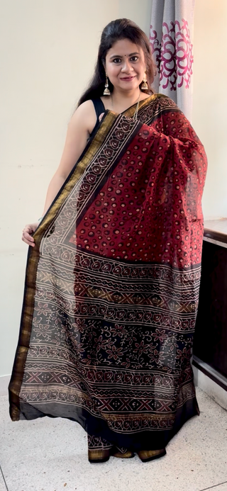 Ajrakh Print Maheshwari Silk Saree with Unstitched Blouse Piece