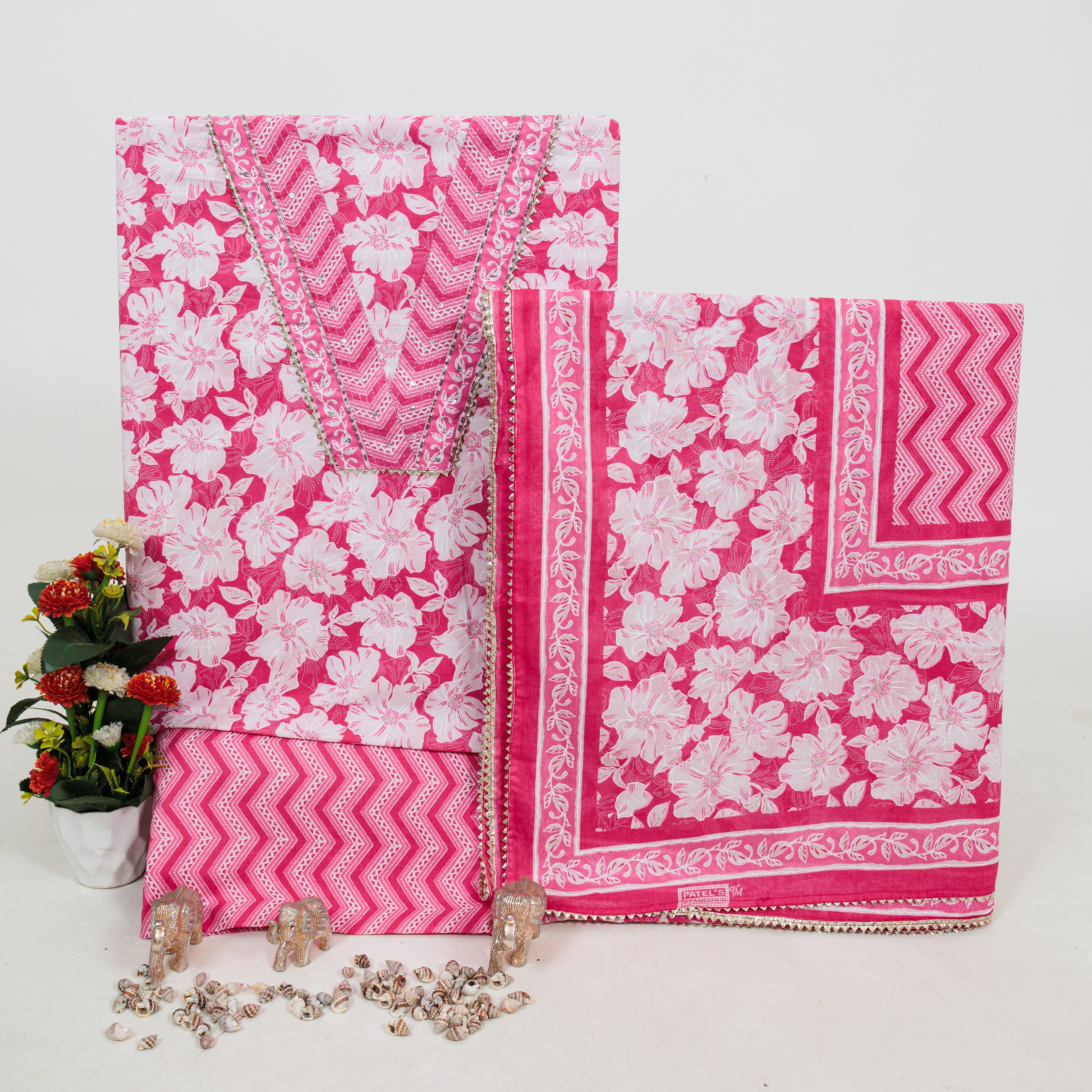 Pink Color Pure Cotton Office Wear Suit Fabric with V neck embroidery